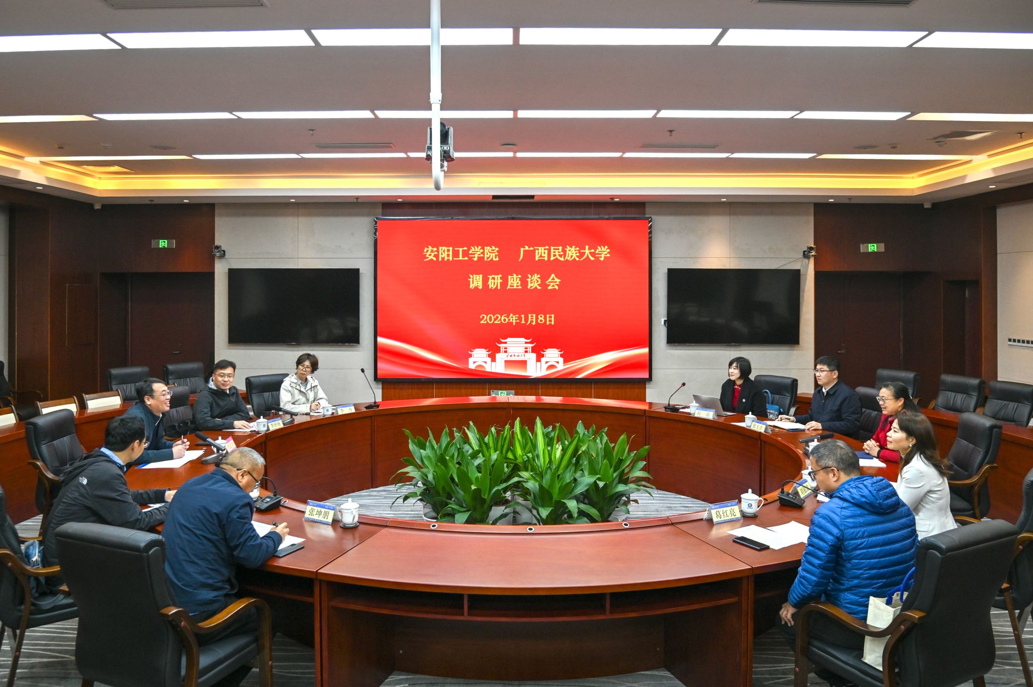 【大学生通讯社报道】1月8日下午,安阳工学院党委副书记、校长沈记全一行到beat365亚洲体育官方网站调研,双方在相思湖校区文化研习基地展开交流座谈,beat365亚洲体育官方网站党委副书记、校长韦仕珍出席座谈会,双方有关职能部门、学院负责人与会。