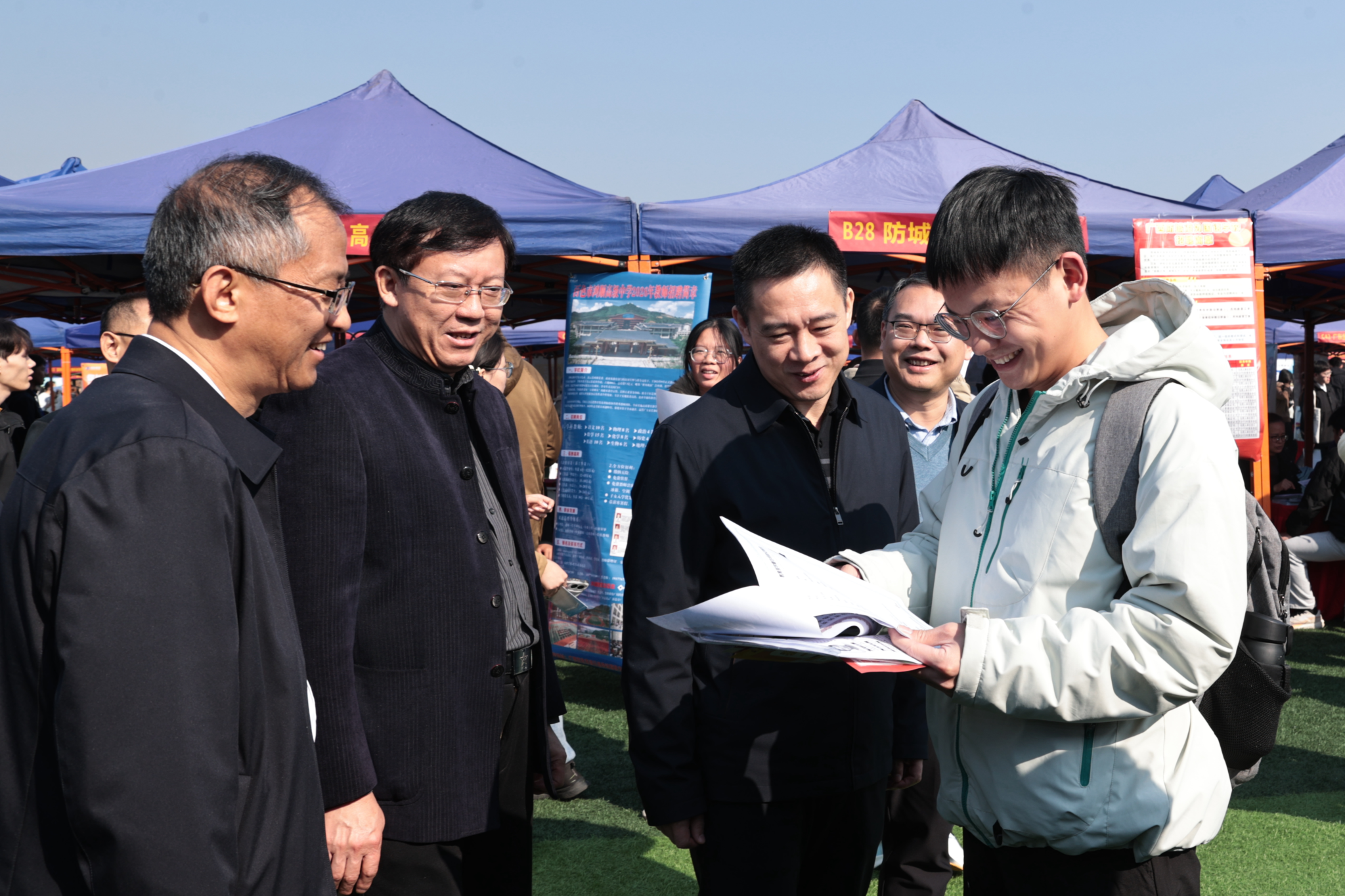 【大学生通讯社报道】1月10日上午,广西2026届综合性高校毕业生就业双选会暨广西2026届“少数民族高层次骨干人才计划”毕业生就业双选会在beat365亚洲体育官方网站思源湖校区李宁田径场举行。自治区教育厅副厅长傅源方,beat365亚洲体育官方网站党委书记唐平秋、党委副书记陈铭彬,自治区人力资源和社会保障厅二级巡视员李博等领导到场调研指导,自治区卫生健康委员会、自治区国有资产监督管理委员会、学校学生工作部(处)等有关负责人参加调研。