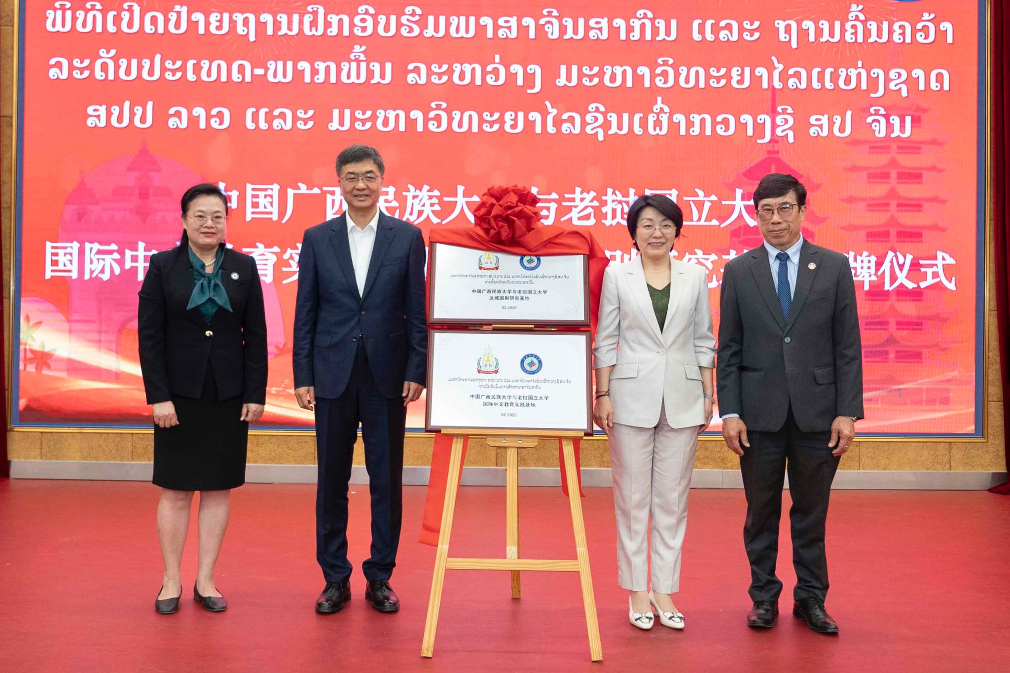 2025年2月23日,在自治区党委书记、自治区人大常委会主任陈刚,中国驻老挝大使方虹共同见证下,beat365亚洲体育官方网站校长韦仕珍和老挝国立大学校长德萨努拉·森登德为两校共建国际中文教育实践基地暨区域国别研究基地项目揭牌