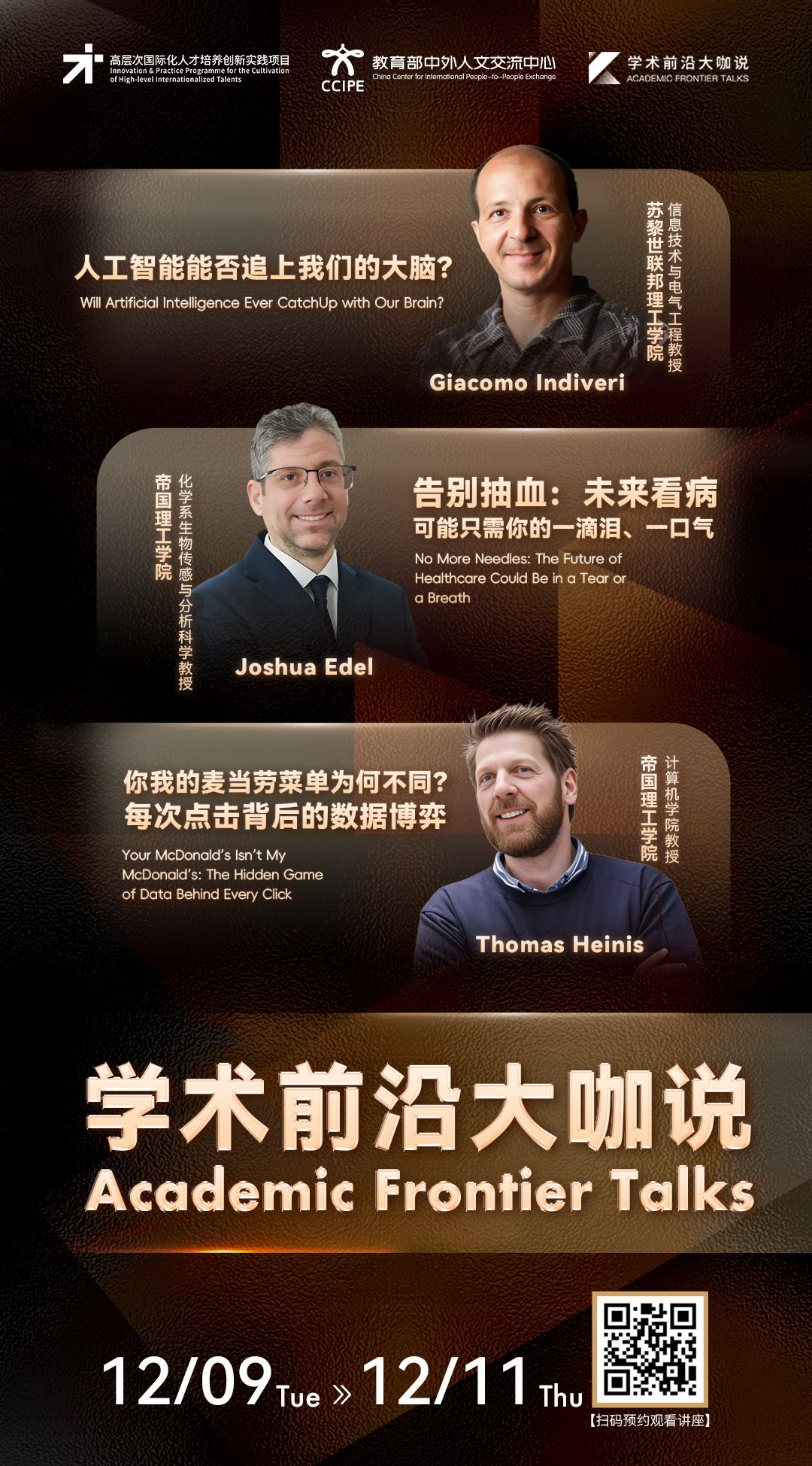 作为高层次国际化人才培养的重点项目,“学术前沿大咖说”讲座持续升级赋能。本期我们特邀帝国理工学院教授、苏黎世联邦理工学院教授,从类脑计算、生物传感与商业智能三大前沿维度,带来兼具理论深度与实践价值的前沿分享,助力青年学子在交叉学科浪潮中抢占先机、实现“破圈”成长。