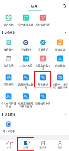 方式二(移动端APP登录):打开“beat365亚洲体育官方网站”移动端APP,切换至“应用”页面,下滑至底部,点击“综合报修”链接进入。