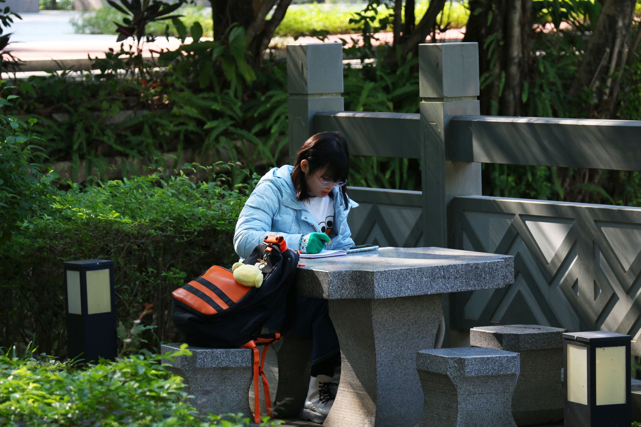 相思湖畔、图书馆前,虽已入冬,但树木依旧翠绿,你和青葱树木,在阳光的照射下都格外迷人。