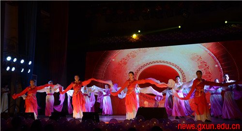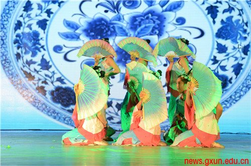 “天青色等烟雨,而我在等你…… ”9名身着白绸缎衣服的女子,手拿折扇伴着轻柔的音乐翩翩起舞,广西农业职业技术学院的民族舞《青花瓷》仿佛将观众带到那烟雨朦胧的江南美景中。广西国际商务职业技术学院、广西艺术学院、广西幼儿师范高等专科学校等驻邕高校通过节目表演,祝福人武学院建院二十周年。