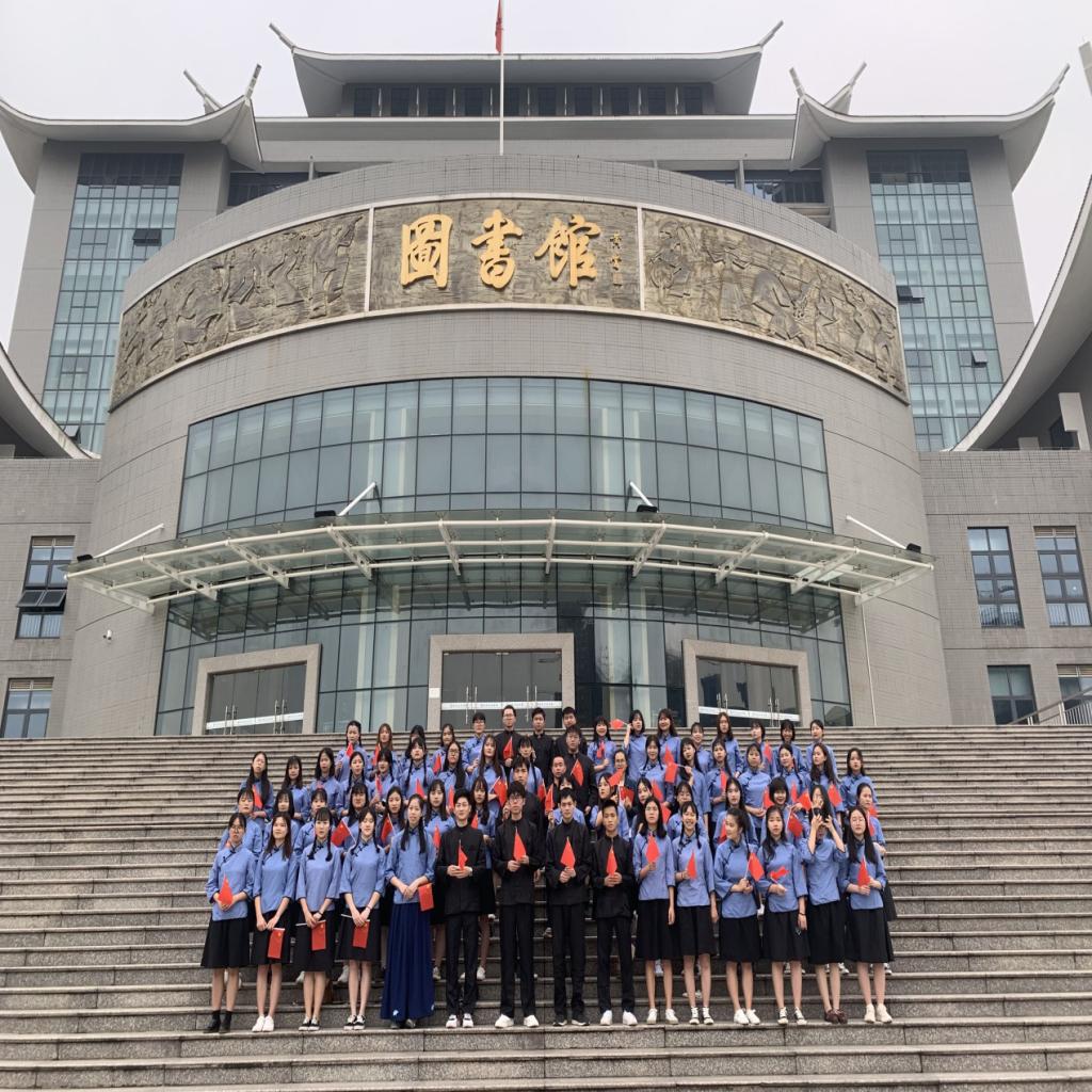在图书馆门前合影留念,以V字型表示“胜利、成功”之意,让未来激发无限可能。