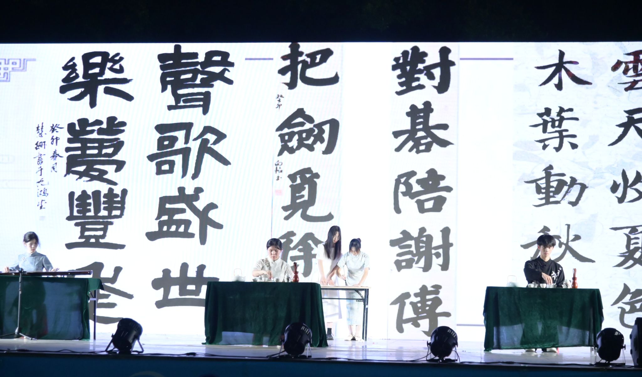 琴音悠悠,秋夜的微风,送来一缕茶香与墨香——格茗茶艺社与书法协会共同表演《墨韵茶香》,由同学们在现场展示完整的茶艺流程和书法写作。手腕一提一落之间,铁画银钩。碧绿的茶汤蒸出氤氲热气,尽显茶道魅力。