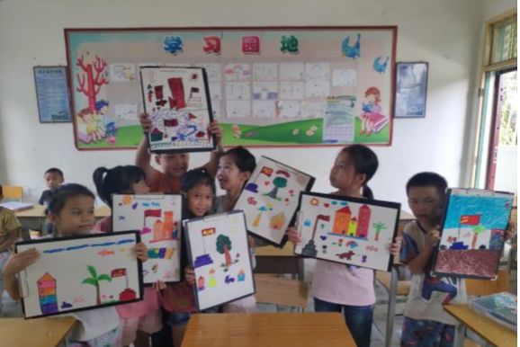 “老师,这是我画的我们家”“老师,这是宇宙飞船,我长大了想当宇航员”……孩子们挥舞着七彩画笔,在志愿者教师的指导下,稚嫩的小手在画纸上自由挥洒,从青山绿水到高楼大厦,从动物世界到梦幻星空,每一幅作品都充满了童真与想象。而每周五与大哥哥大姐姐的相约,成为孩子们最开心的期待。每一次绘画课程,不仅仅是简单地描摹勾勒,更是孩子们心灵的一次释放与探索。通过绘画,孩子们学会了观察生活、感受美好,也让美丽乡村的每一处风景在他们的笔下生动起来,成为传播乡村之美的使者,童绘乡村新‘院’景,共谱时代新篇章。