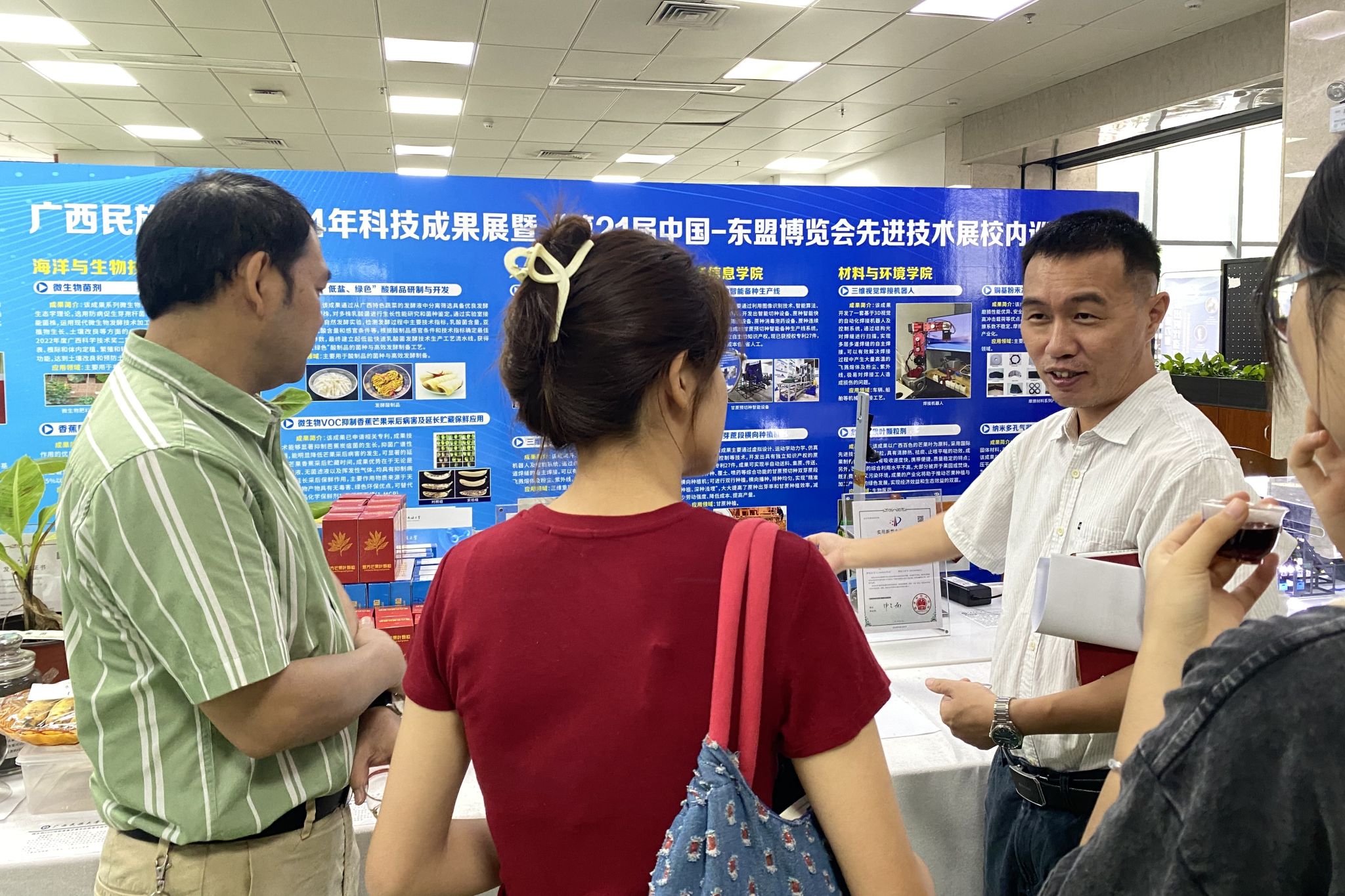 展览涵盖了化学化工、海洋与生物技术、材料与环境、人工智能、电子信息等多个领域,展示了学校在科技创新方面取得的研究成果。成果包括化学化工学院松脂高值化产品;海洋与生物技术学院微生物菌剂、香蕉防病促生微生物菌肥、微生态功能茶、酸制品研制与开发、微生物保鲜技术、植物根结线虫的防治技术;人工智能学院复合3D视觉智能焊接机器人系统、三维视觉面结构光传感器;电子信息学院甘蔗预切种智能备种生产线、预切种双芽蔗段横向种植机;材料与环境学院三维视觉焊接机器人、复方芒果叶颗粒剂、铜基粉未冶金摩擦材料、纳米多孔气凝胶粉体材料等产品。