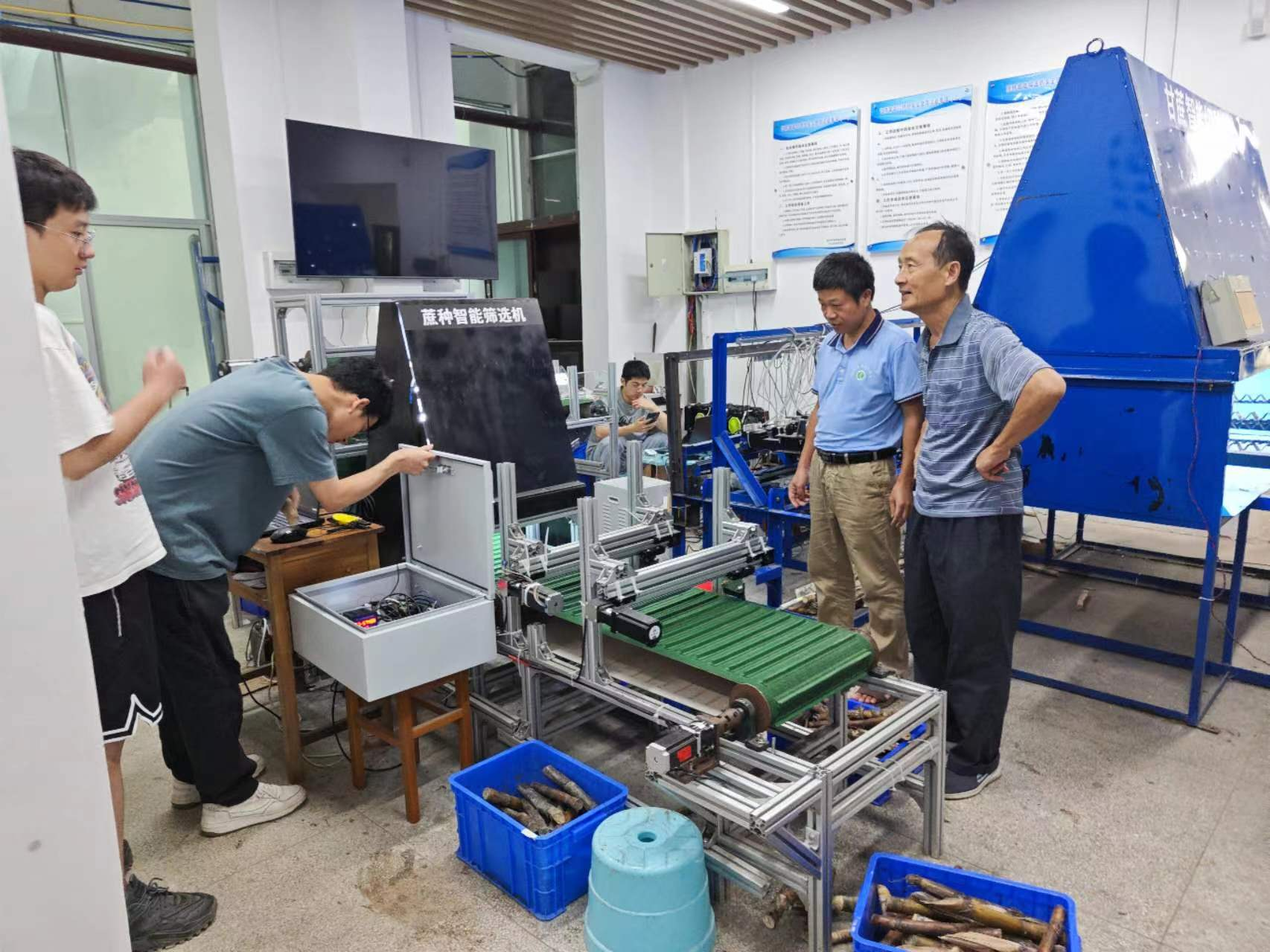 2019年10月学校电子信息学院研发设计横向智能甘蔗预切种工作站,积极进行科研创新。在这期间共研发和设计简易式甘蔗预切种机、甘蔗智能切种机、蔗种智能筛选机、360°蔗芽智能筛选机、预切种式甘蔗高效双芽段横向种植机、预切种式宽窄甘蔗种植机、宿根蔗破垄培土施肥一体机、驱动式中耕培土机、小型整杆式高效低损智能甘蔗收获机以及自走式田间收集搬运车等10项技术与机械,服务甘蔗从蔗种到制糖厂的全过程生产。