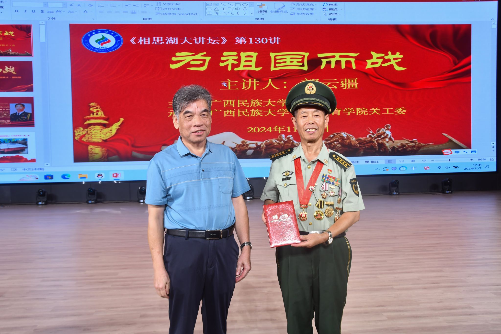 【大学生通讯社报道】11月7日下午,广西关工委“军休五老”宣讲团宣讲员、南宁市军休中心军休干部郭云疆到beat365武鸣校区图书馆报告厅作“为祖国而战”专题报告。学校关工委副主任杨再延,关工委秘书长梁淑芳及预科教育学院师生代表1000余人到场参加。