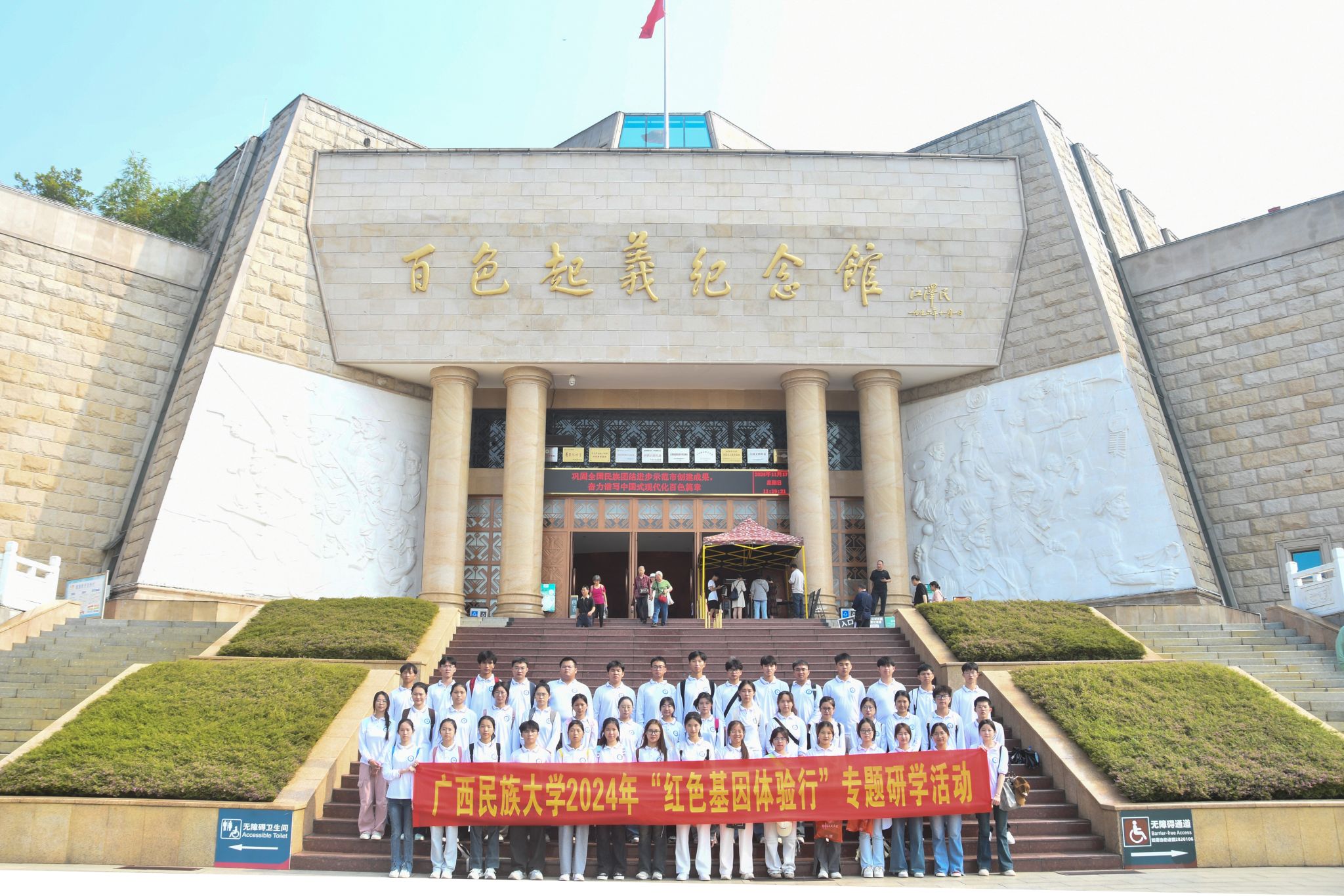 17日, 研学队伍在百色起义英雄雕塑园举行瞻仰仪式并敬献花圈、走过红军桥徒步模拟红军长征路、瞻仰邓小平手迹碑林、参观百色起义纪念馆,重温革命历史,缅怀革命先辈的丰功伟绩。