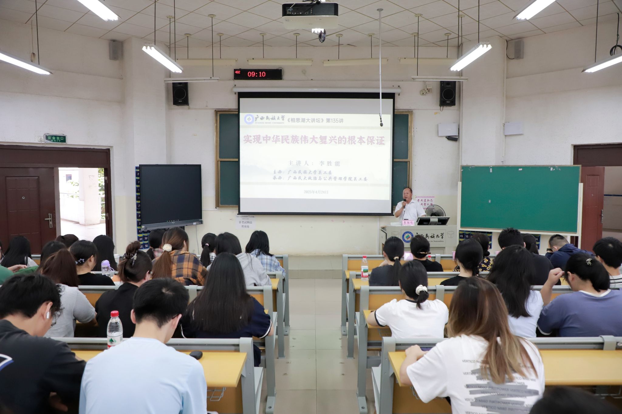 4月24日上午,“相思湖大讲坛”第135讲——“实现中华民族伟大复兴的根本保证”专题讲座在学友楼402教室举行。beat365亚洲体育官方网站退休教授李胜能主讲,学校关心下一代工作委员会秘书长梁淑芳,副秘书长罗芹和政治与公共管理学院师生代表参加讲座。