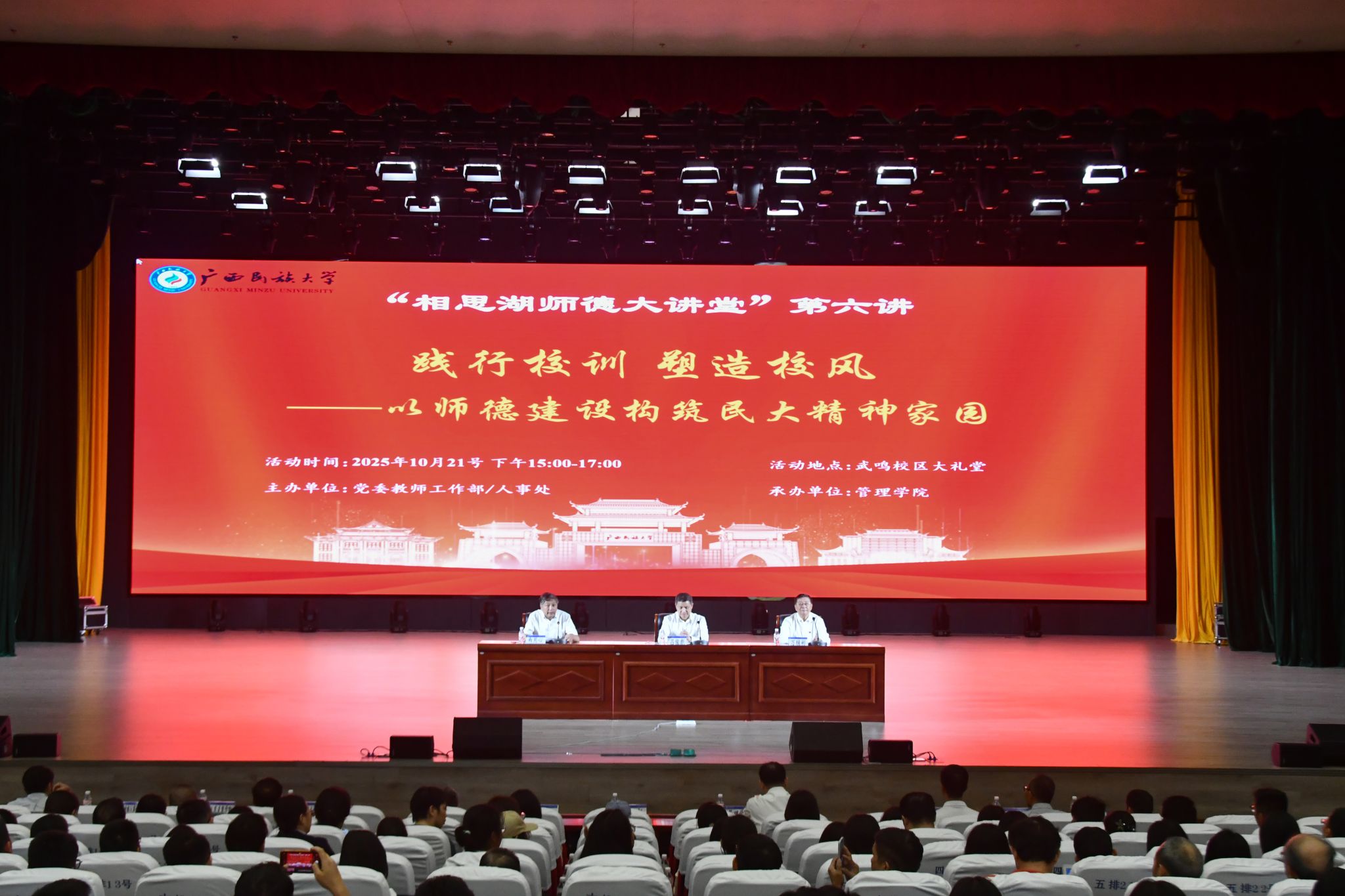 “相思湖师德大讲堂”第六讲活动由党委教师工作部/人事处主办,管理学院承办,武鸣校区各学院教职工代表和学生代表参加讲座。(初审:李伟山 编辑:黎倩雅 实习编辑:樊甲利 复审:韦利坤 终审:孙寿媚)