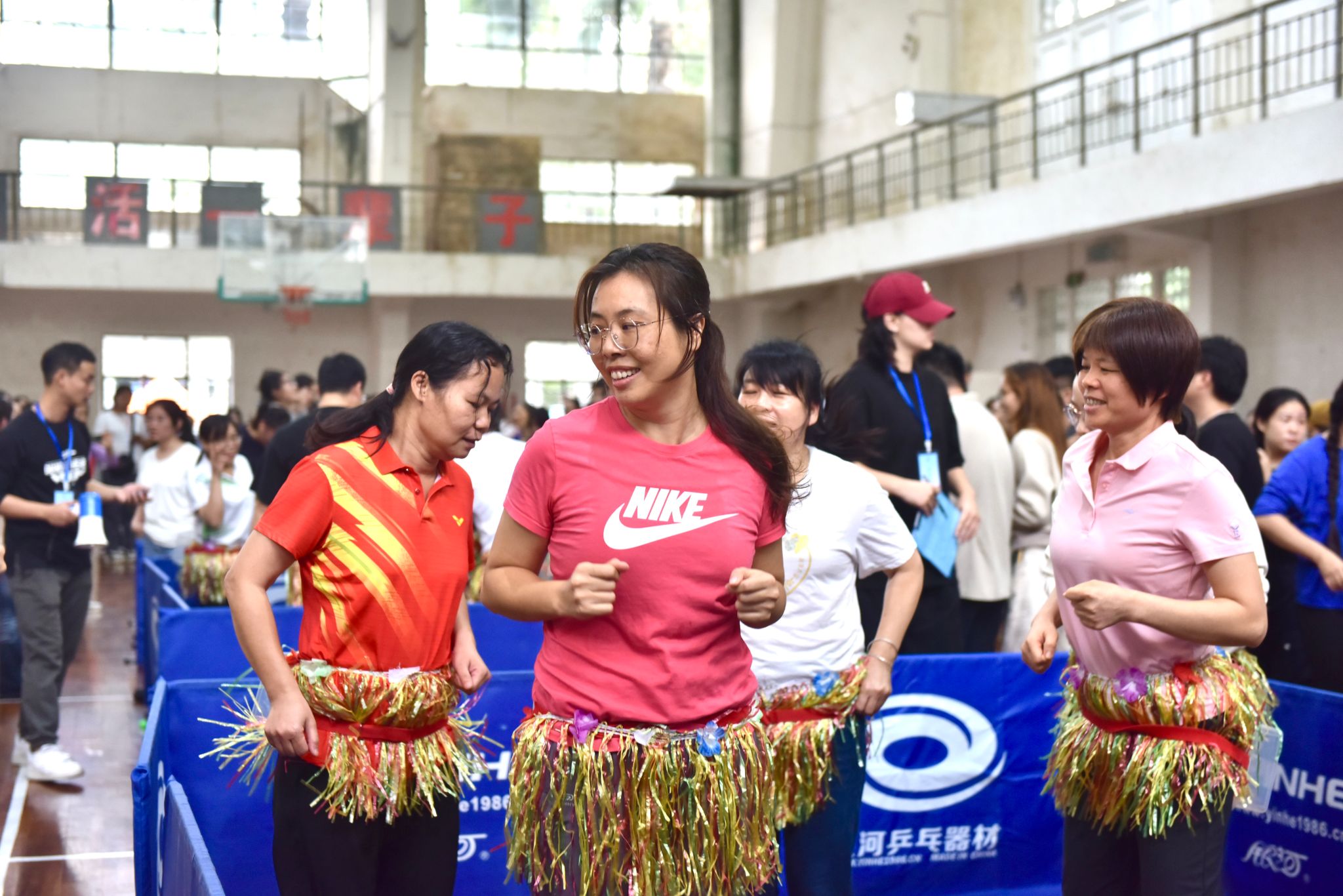 民族体育与趣味体育项目区域,欢笑声、喝彩声此起彼伏。背篓绣球的彩球在空中飞舞,8人运球投篮的团队配合行云流水,跳长绳的队伍如波浪翻腾。尤为引人注目的是趣味草裙舞,五彩裙摆翩然飞扬,教职工们随音乐尽情舞动,将赛场变成一片欢乐的海洋。