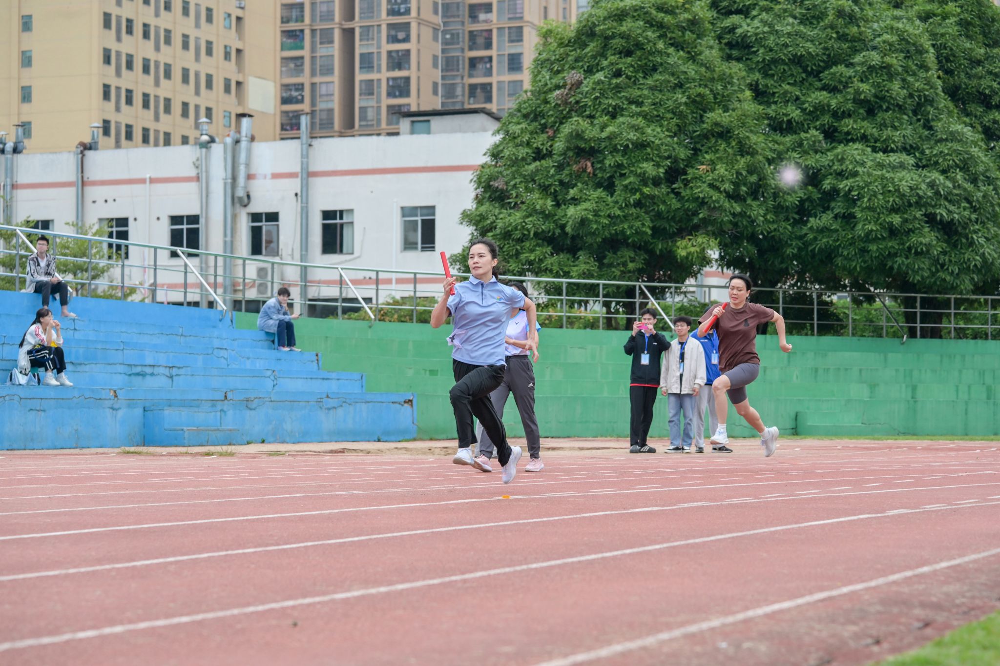 发令枪响,赛场瞬间被点燃。百米跑道上,教职工们奋力摆臂,在加油欢呼声中全力冲刺;八百米赛程中,他们稳住呼吸、掌控节奏,在耐力与速度的平衡间展现智慧;4×100米接力区,每一次精准交棒,都凝聚着团队的信任与默契。