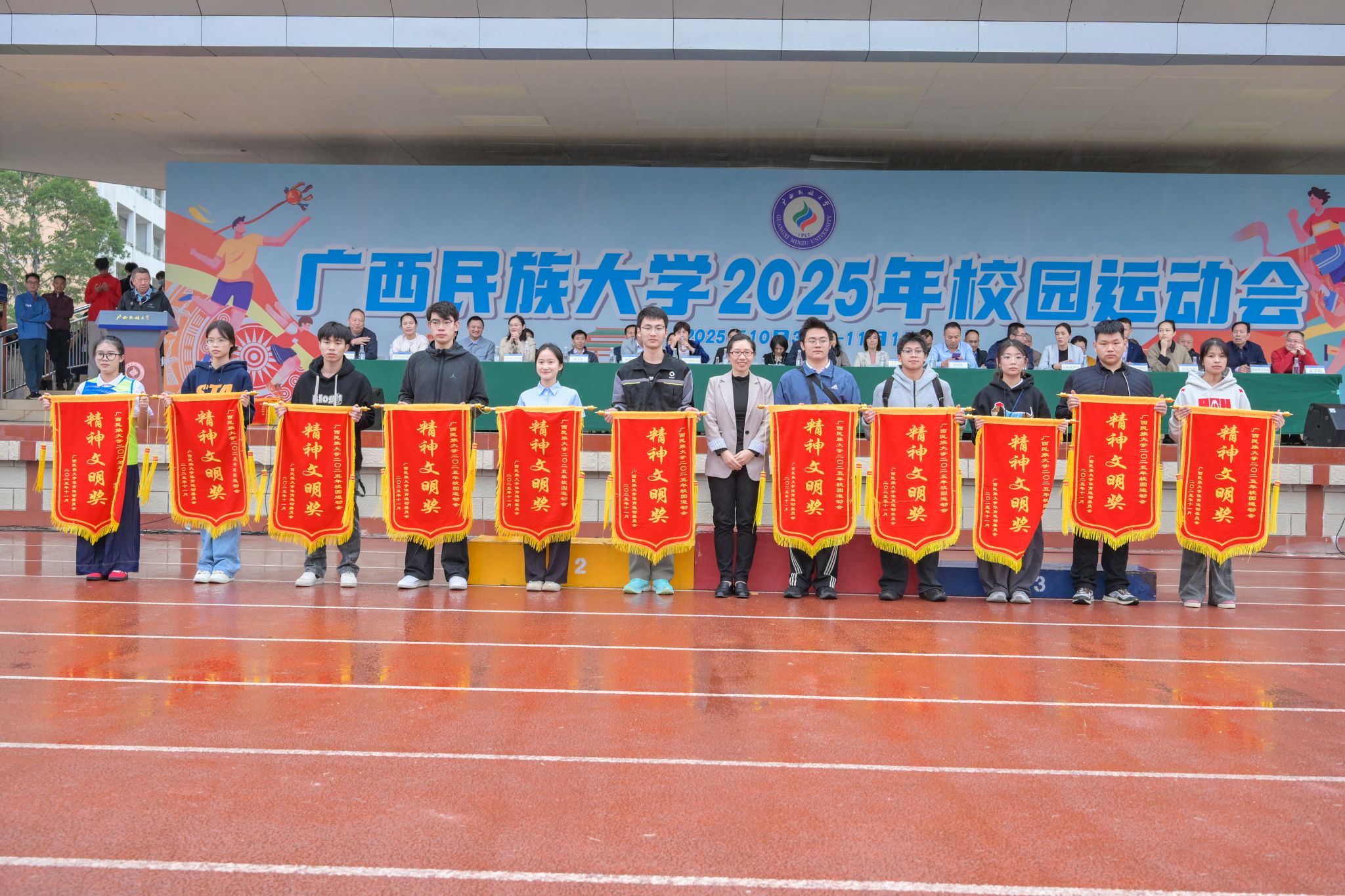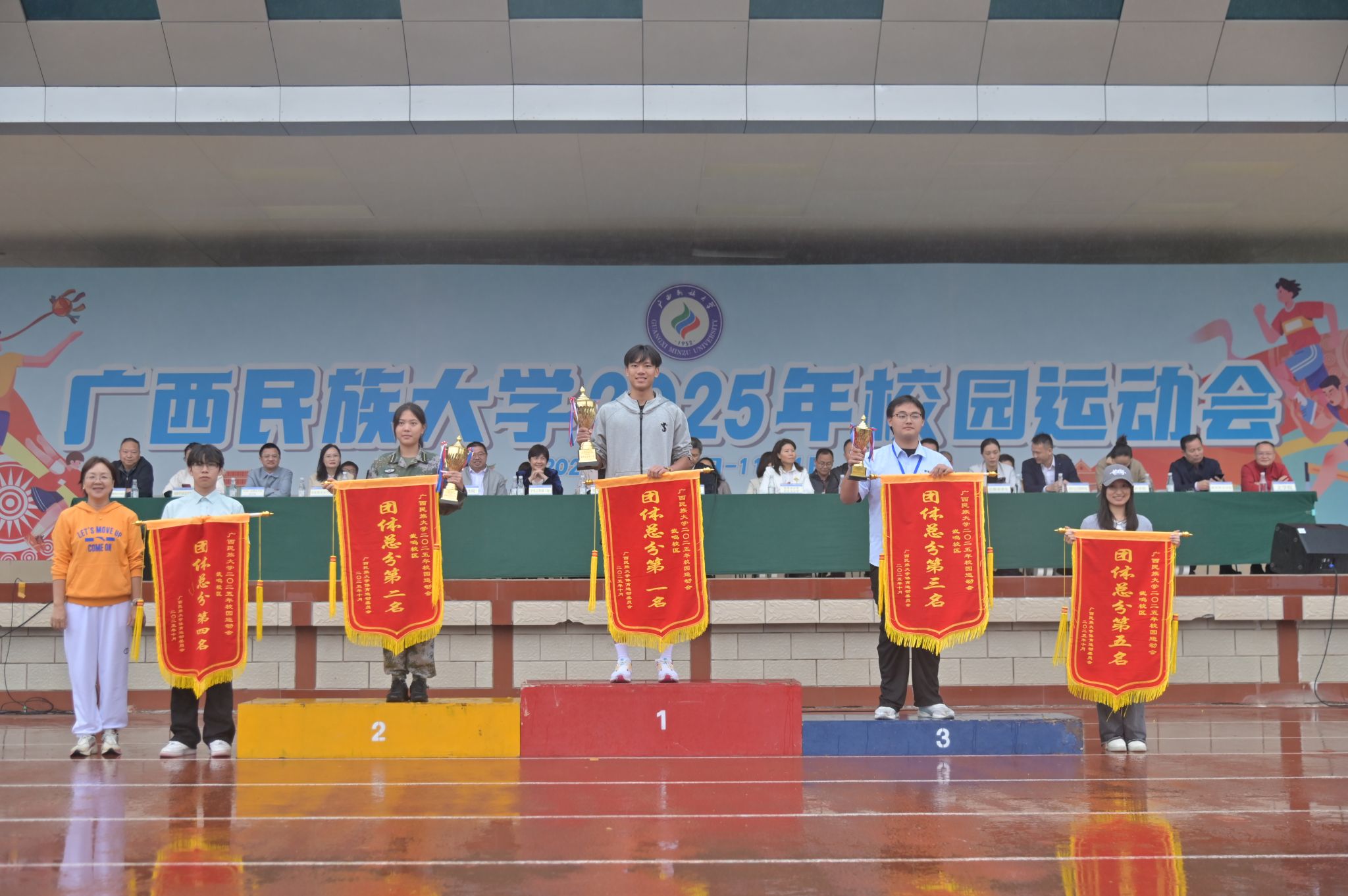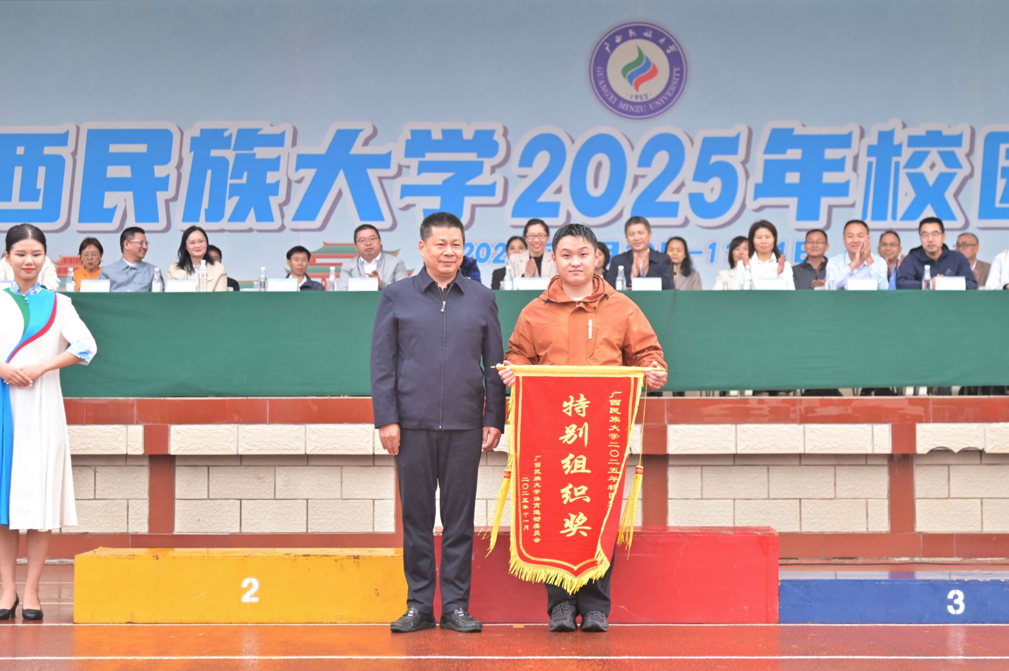 吕俊彪向本次运动会取得优异成绩的运动健儿致以祝贺,对裁判员、工作人员与志愿者的辛勤付出表示感谢。他指出,本届运动会集中展示了学校体育事业发展成果。赛场上,运动员们奋勇争先、挑战自我;赛场下,工作人员、志愿者们的默默奉献为运动会顺利举办提供坚实保障,广大师生热情参与、文明观赛,生动诠释了“团结共进、传承创新”的校风,充分展现民大人不畏艰难、追求卓越的精神风貌。希望广大师生将体育精神内化于心、外化于行,秉持求真务实的作风,将饱满的体育热情融入学校建设中,转化为推动学校高质量发展的强大动力,共同为全面建设特色鲜明的高水平现代化综合大学贡献力量。