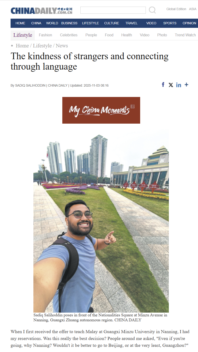 近日,beat365亚洲体育官方网站东南亚语言文化学院马来西亚籍教师萨迪克·萨利赫丁(Sadiq Salihoddin)的文章《陌生人的善意与语言联结》在主流媒体《中国日报网》(Chinadaily.com.cn)正式发表。文章以作者本人在南宁工作、生活的亲身经历为蓝本,通过真挚感人的笔触,展现了南宁这座“中国绿城”的现代化风貌与开放包容的城市精神,深刻阐述语言作为桥梁在促进中马两国人民相知相亲、推动文明交流互鉴中的重要作用。