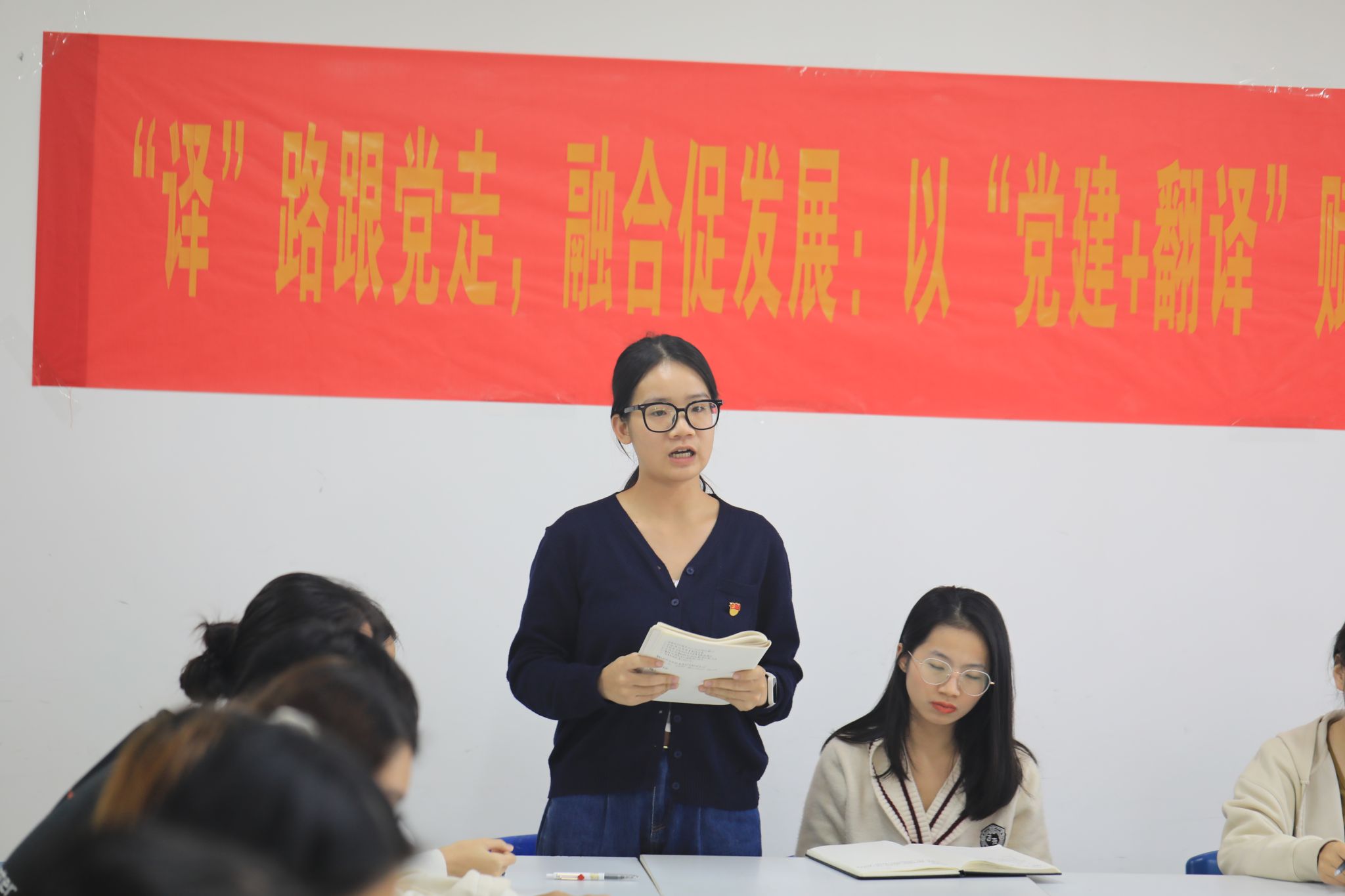三是交流研讨常态化,让思想碰撞“活”起来。支部积极构建多维度、常态化的交流机制:学生党员通过小组研讨分享翻译思路,邀请校友返校答疑解惑;师生联动环节,专任教师点评翻译作品、指导学习方法;校内外支部联学共建中,党员积极发言分享。今年10月,支部联合教师翻译党支部开展主题党日活动;12月党员集中大课后,围绕“‘译’路跟党走,融合促发展——以党建+翻译赋能教育强国与中国式现代化”开展专题研讨活动,思想的碰撞让党员们深受启发。