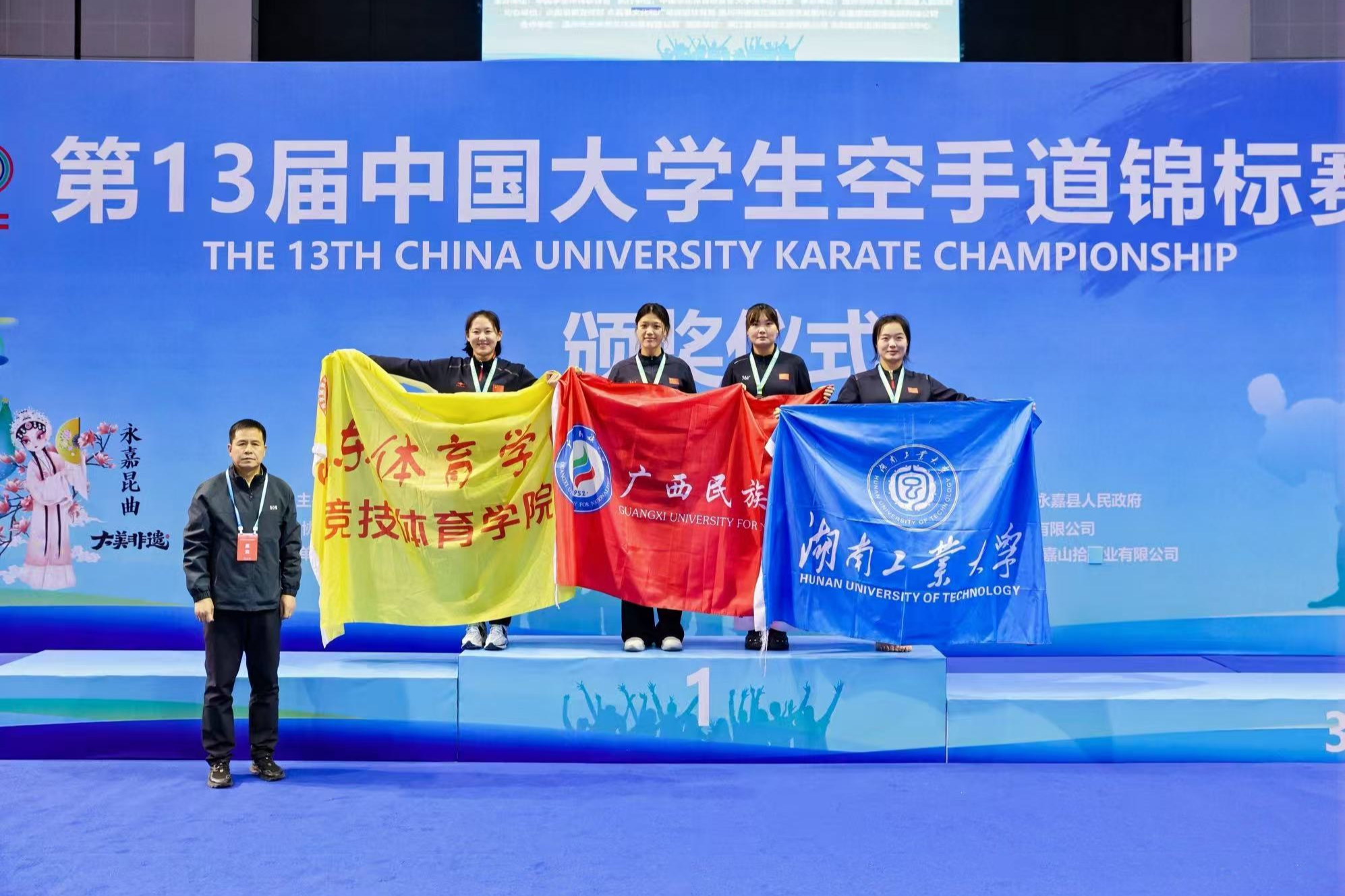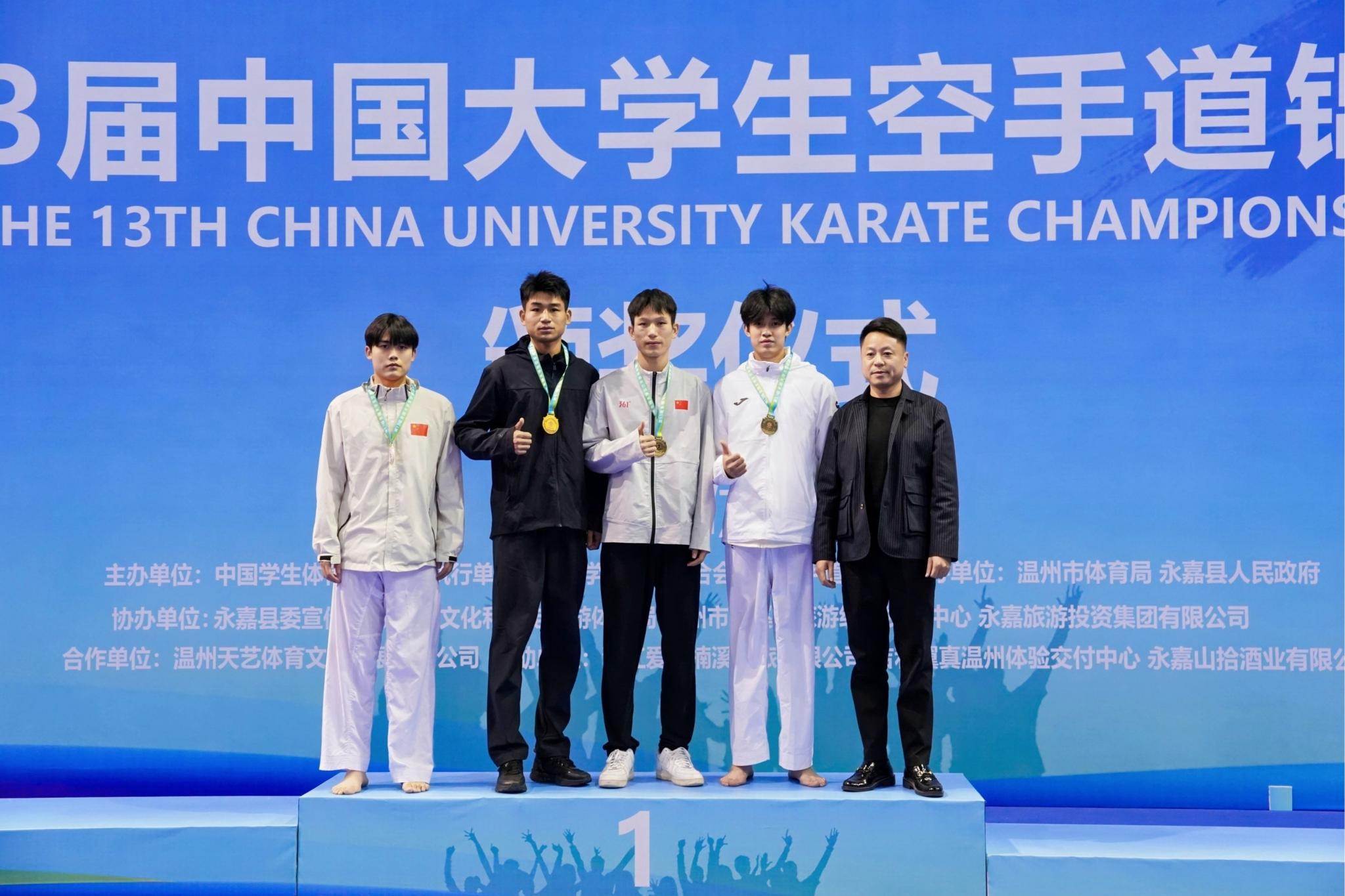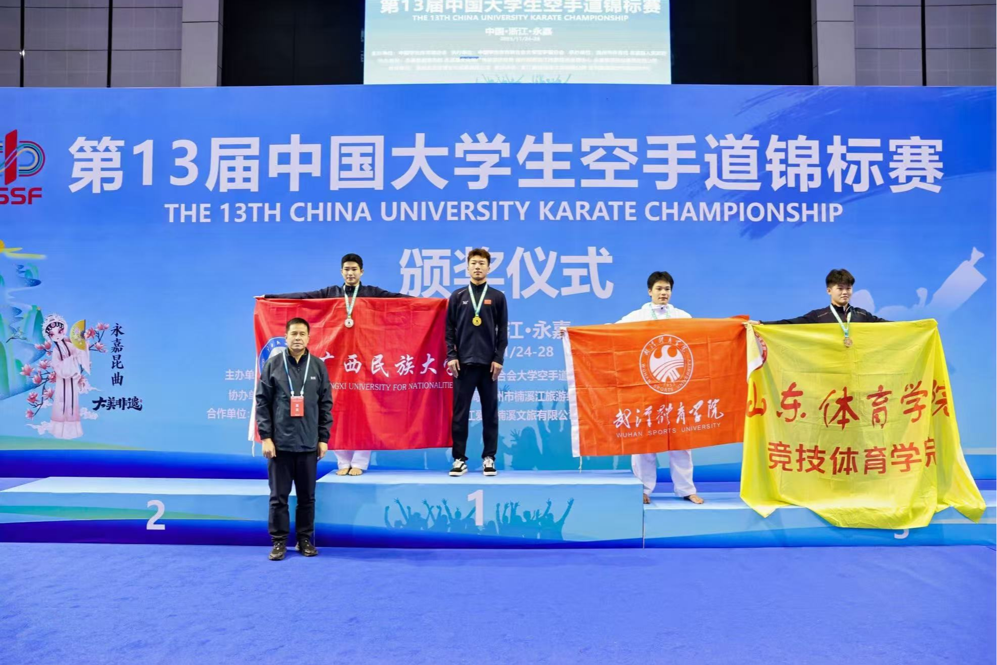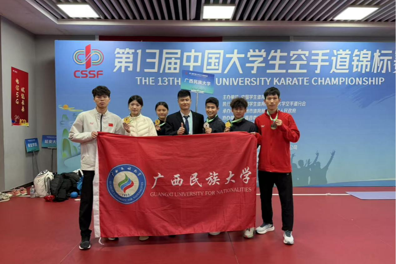本届赛事由中国学生体育联合会主办,中国学生体育联合会大学空手道分会执行,永嘉县人民政府承办。作为国内大学生空手道领域的顶级赛事,本次比赛共吸引来自全国77所高校的77支运动队、共计510余名运动员同台竞技。在高手云集的丙A组(高水平组)比赛中,学校体育与健康科学学院健儿在各个级别中披荆斩棘:黄泽恩(男子-62kg)、黄意婷(女子-53kg)、苏家洁(女子+61kg)勇夺桂冠;卓敏(男子-68kg)斩获银牌;闭棋桂(男子-71kg)夺得铜牌;覃炳桂(男子-74kg)亦取得第五名的佳绩,共同铸就了这一高光时刻。