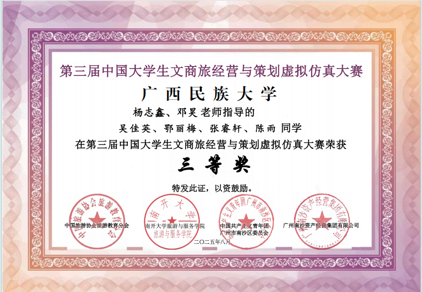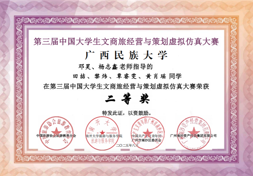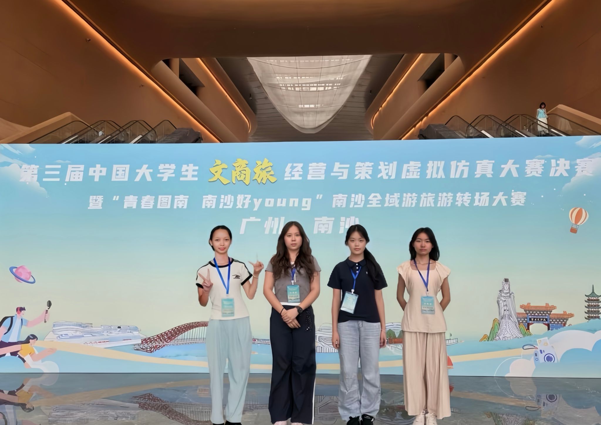 近日,第三届中国大学生文商旅经营与策划虚拟仿真大赛全国总决赛在广州南沙举行。beat365亚洲体育官方网站管理学院学子组成的两支队伍表现优异,斩获全国二等奖1项(排名全国第21)、三等奖1项、实践特等奖1项。在同期举办的“青春图南 南沙好young”南沙全域游旅游转场大赛中,两支队伍再获2项优胜奖,邓昊和杨志鑫两位教师获评“优秀指导教师”。