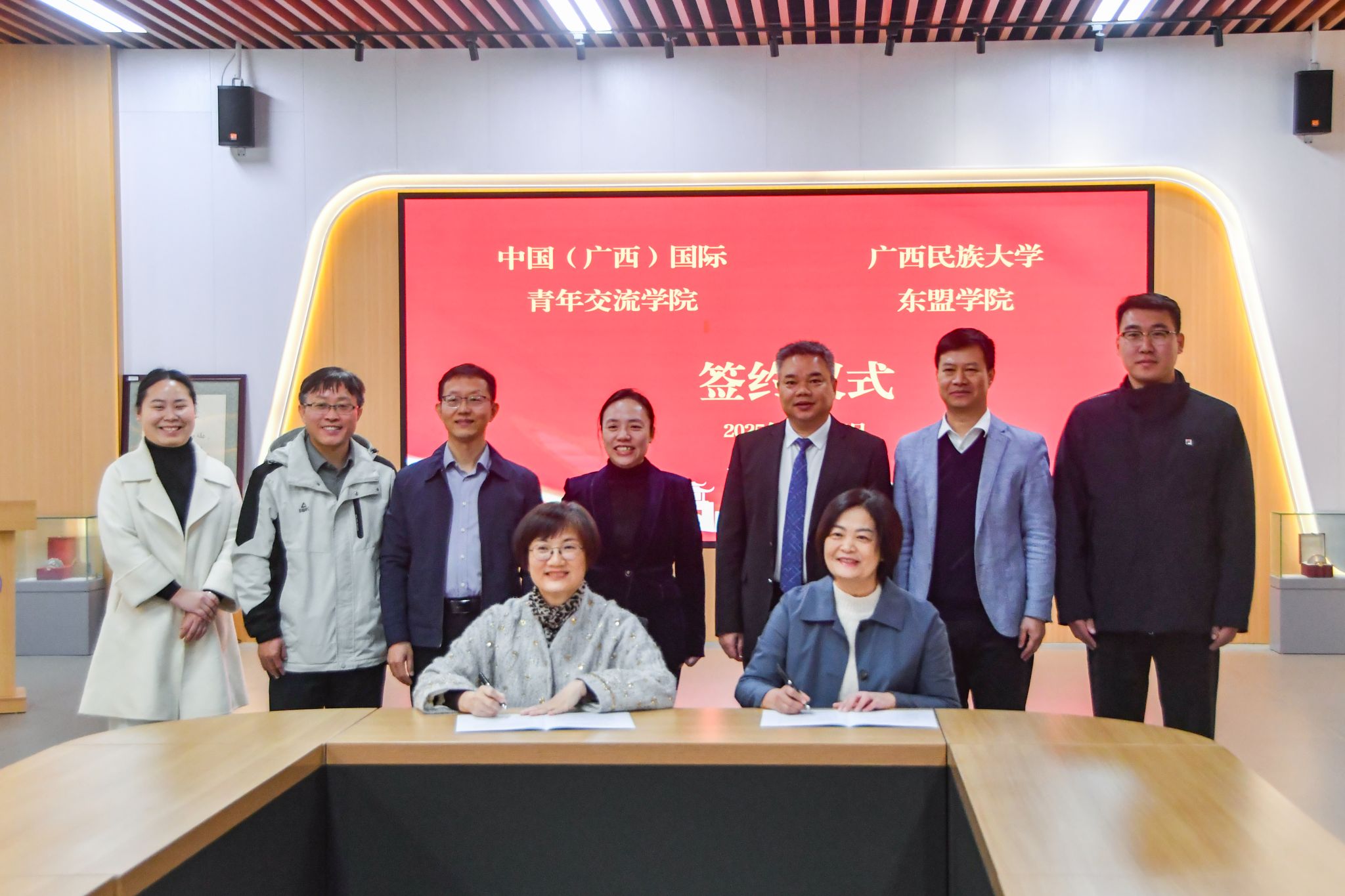 左向蕾、陈铭彬共同见证双方代表签订中国(广西)国际青年交流学院与beat365亚洲体育官方网站东盟学院合作框架协议。(初审:覃秀红 编辑:黎倩雅 复审:韦利坤 终审:孙寿媚)