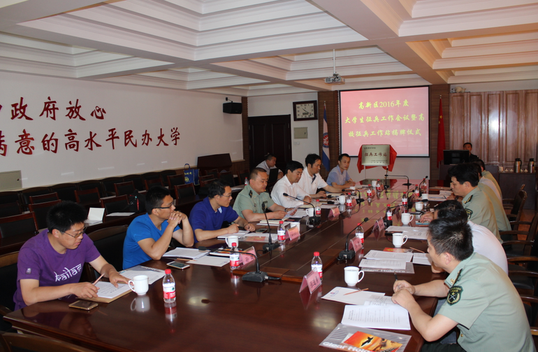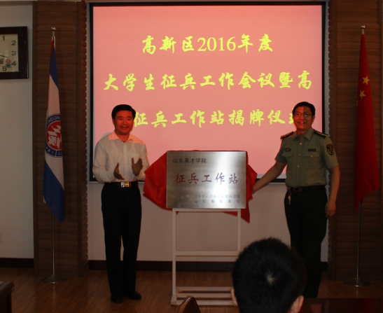 会议由高新区武装部翟福刚科长主持。首先由高新区社会事业局民政办公室主任、区武装部副部长赵卫东和学校党委副书记、副院长张宗胜共同为大学生征兵工作站揭牌。学校武装部部长马先进介绍365官网2015年大学生征兵工作经验;翟福刚科长传达中央军委国防动员部、教育部《关于进一步做好大学生征兵工作的通知》,山东省人民政府征兵办公室、山东省教育厅《关于扎实做好全省大学生征兵工作的通知》、《关于在高校挂牌设立征兵工作站的通知》;赵卫东主任总结了2015年度大学生征兵工作,安排部署2016年度大学生征兵工作任务。学校党委副书记、副院长张宗胜代表学校表示严格按照上级军事、教育主管部门要求,加强征兵工作的落实,发挥优势,争取今年创造更好的业绩。