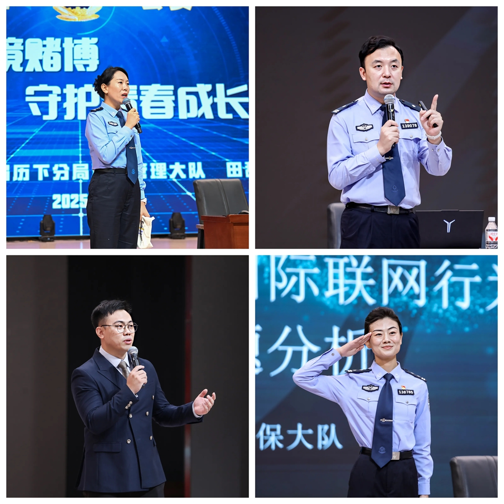 本次活动聚焦大学生群体常见的安全风险,集结公安、法律等领域的专业人士,以专题授课与普法脱口秀等创新形式开展宣传教育。市公安局刑警支队反诈中心民警以《为什么被骗的总是你》为题,结合真实案例剖析电信诈骗手法,引导学生增强识骗、防骗能力;市司法局推荐律师带来的《就这么简单》普法脱口秀,用轻松幽默的方式解读法律知识,有效提升了学生的法治意识;历下分局民警分别围绕跨境赌博的危害和非法定信道联网的风险开展警示宣讲,通过互动问答强化学生远离赌博、守法上网的自觉性;市国家安全局民警则以《开学第一课:请做好三次安全签到》为主题,从国家、校园、个人三个层面引导学生树立总体国家安全观。