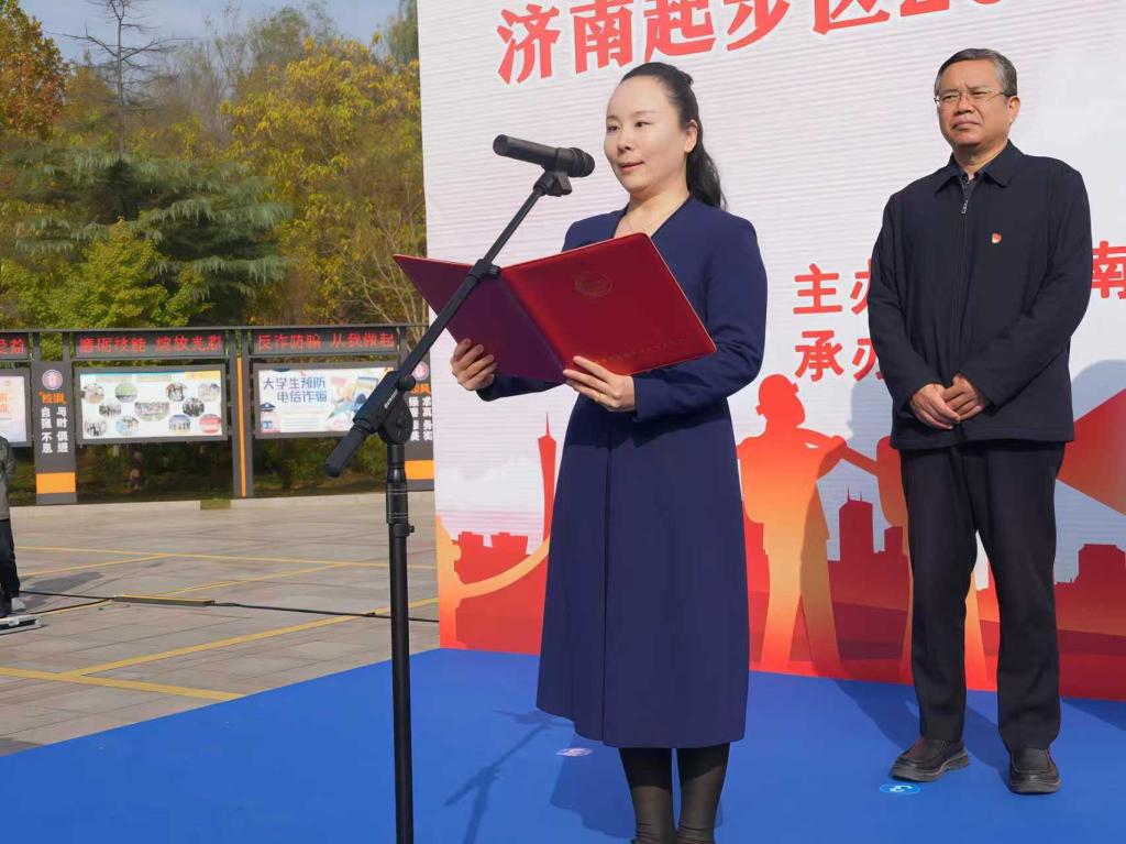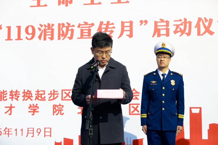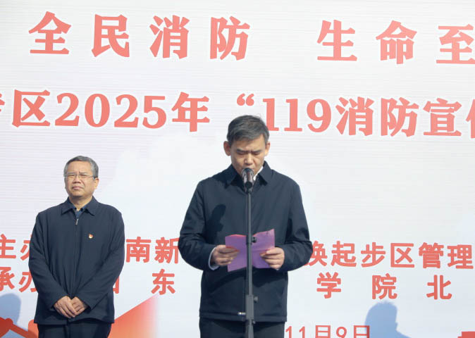 为进一步提高全民消防安全意识,积极营造浓厚的消防安全宣传氛围,11月9日济南起步区以”全民消防,生命至上——安全用火用电”为主题的2025年“119消防安全宣传月”启动仪式暨疏散逃生演练活动在365官网举行。起步区综合执法部部长孟克非,社会治理部副部长王殿强,崔寨街道党工委副书记、街道办主任张博,消防救援大队长王永武,学校纪委书记、副校长李晓玲及各部门、二级学院负责人等1000余名师生代表参加此次活动。活动由起步区社会治理部李智魁副部长主持。