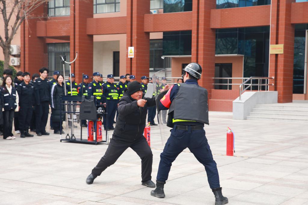 实操技能竞赛环节紧张激烈,精彩纷呈,充分展现了保安人员的专业能力。形象与礼仪展示,整齐的着装、挺拔的军姿、规范的执勤用语,彰显了新时代高校保安员良好的精神风貌和服务意识;消防技能比拼,选手们熟练操作灭火器扑灭“初起火情”,精准完成消防水带连接与铺设,动作一气呵成,展现了扑救初期火灾的过硬本领;装备器械穿戴演练,选手们迅速穿戴各类防暴装备,熟练掌握使用技巧,动作标准流畅,展示了保安员维护校园安全秩序的专业形象;“最小单元”应急演练,面对模拟的“校园突发暴力冲击”,参赛队员沉着冷静,合理运用防暴盾牌、钢叉等器械,协同配合,果断处置,有效控制了事态,凸显了团队协作和应急防暴能力。
