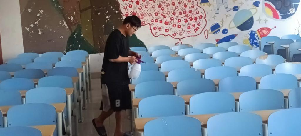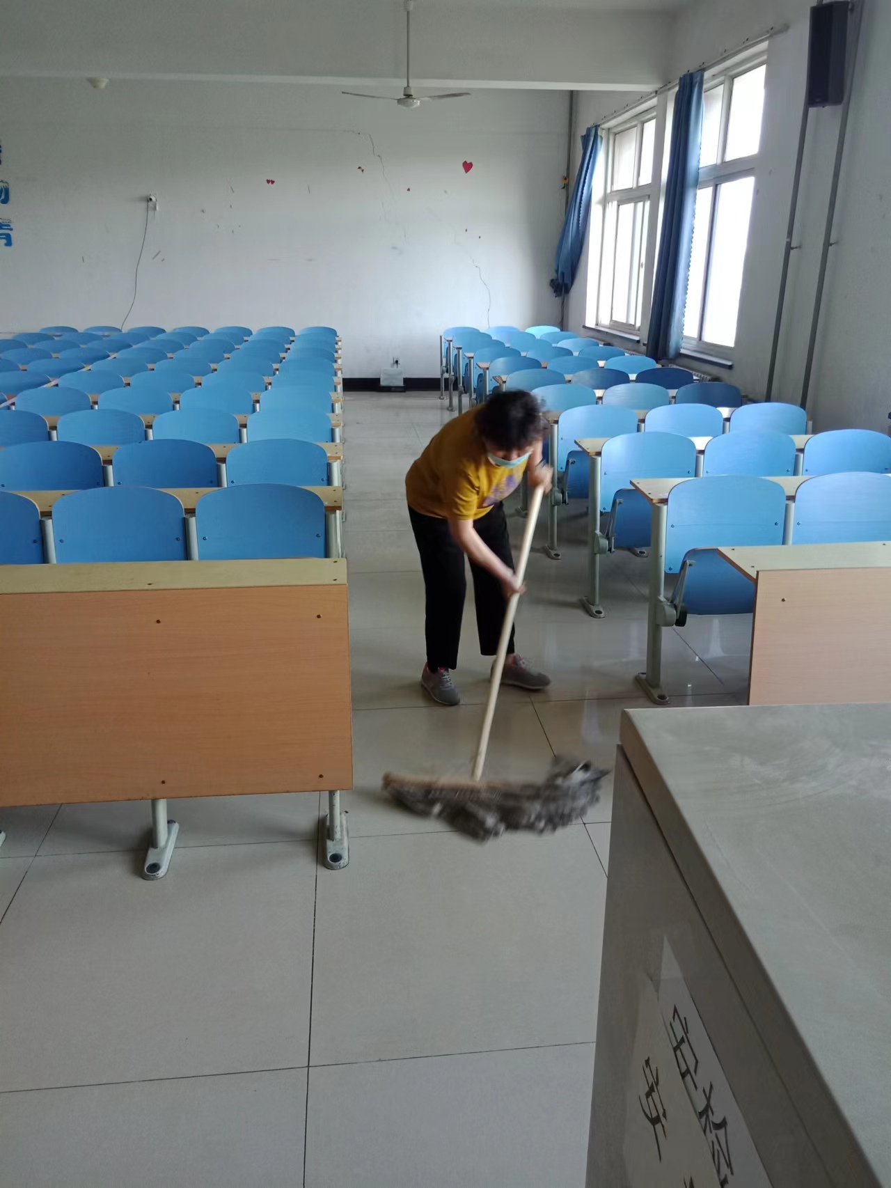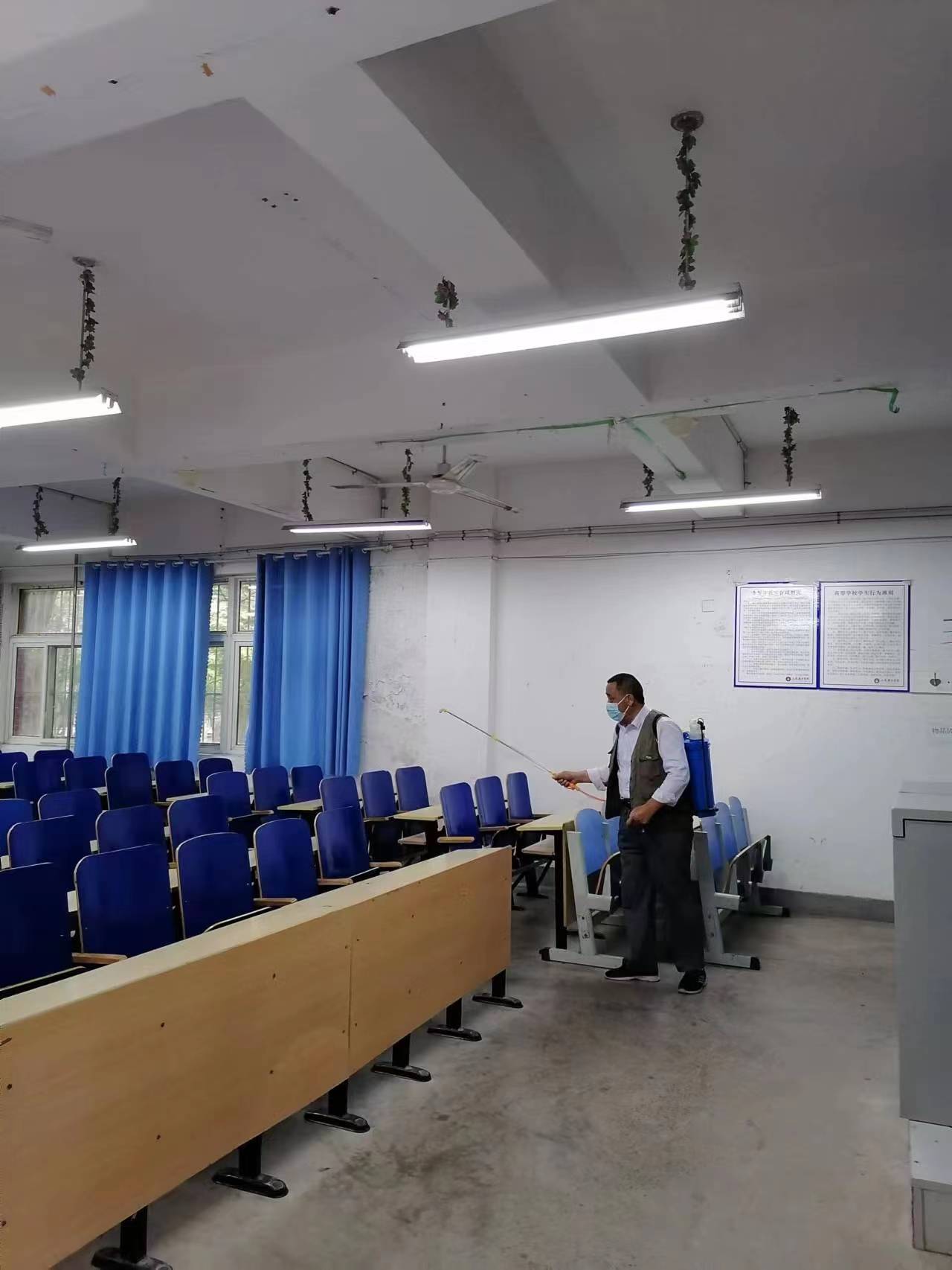 ——教室保障中心积极组织员工打扫教室卫生,地面喷洒消毒。