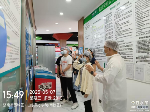 在餐厅经理孙宏伟的引导下,郑悦老师带领学生代表重点参观餐厅“三证公示栏”(餐饮服务许可证、营业执照、从业人员健康证),随机抽取数名后厨员工的健康证信息进行核验,确保人证一致、有效期合规。针对学生关注的食材溯源问题,餐厅经理孙宏伟现场调阅供应商资质档案与冻品入库台账,展示“每日肉类检疫报告”及“食材保质期巡检记录”,郑悦老师强调:“从采购到餐桌,每个环节必须可追溯、可倒查。
