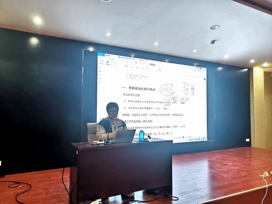 第二场由业内知名哲学博士卢欣老师为学生讲授政治复习重点、难点并发放了培训讲义。卢欣老师客观分析考研形势,划重点、讲难点,将《马克思主义基本原理》、《思想道德与法治》、《毛泽东思想和中国特色社会主义理论体系概论》知识串讲。卢博士讲课幽默风趣,全场学生奋笔疾书,报告厅书瞬间变为政治讲堂。讲座结束,学生纷纷反映时间虽然短暂,但收获满满,真正沉浸式体验到了一堂大师级政治课堂。