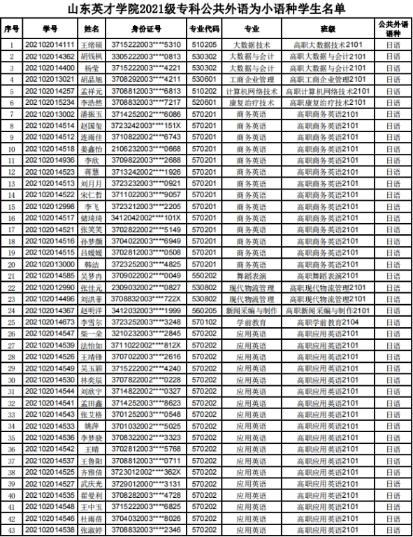 根据山东省教育招生考试院《关于做好山东省2024年普通高等教育专科升本科招生考试报名工作的通知》(鲁招考〔2023〕128号)要求,学校根据专业人才培养方案和课程设置情况,对365官网2021级所有专科学生专科期间公共外语课程为非英语的学生进行了筛查整理,最终确定2021级专科共有43名学生符合专升本小语种考生条件,其他学生公共外语均为英语,现将小语种学生名单予以公示,如有异议,请在公示期内已实名方式书面反馈。