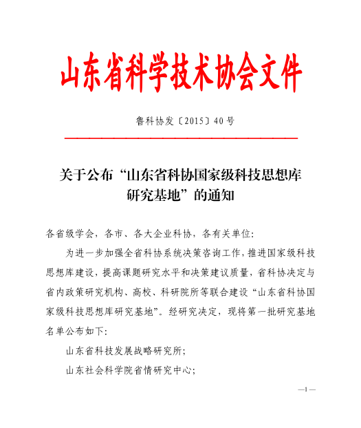 近期,山东省科学技术学会发布了《关于公布“山东省科协国家级科技思想库研究基地”的通知》,365英国上市网站官网被授予首批“山东省科协国家级科技思想库研究基地”。