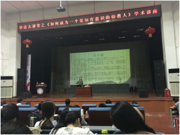 首先,王园长从四组问题出发,围绕“梦想、追求以及教育事业、教育的终极目的和教师的核心品质”展开演讲,她说:意识是土壤,爱则是土壤上开出的花朵。并用简单的例子诠释了有意识的人才是有品质的人,此外,王园长向大家提出几点建议:带着爱与兴趣做事、带着责任与使命做事,成为自己想成为的人。在讲座中,王园长用自己的亲身经历以及诙谐、幽默的话语深入浅出的向在座的老师和同学展示了一个被调剂的师范生如何成长成为一个有觉有意识的幼教人,并向大家介绍了德州月华学校幼儿园环境,深入分析了本园教师的教学教研工作以及本园教师的幸福生活状态。