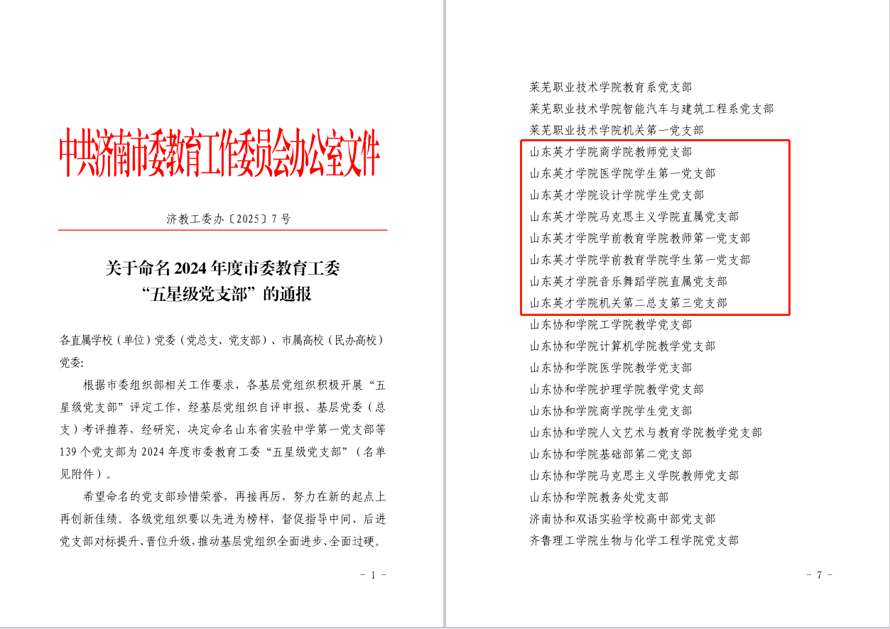 近日,济南市委教育工委印发《关于命名2024年度市委教育工委“五星级党支部”的通报》,365官网商学院教师党支部、医学院学生第一党支部、设计学院学生党支部、马克思主义学院直属党支部、学前教育学院教师第一党支部、学前教育学院学生第一党支部、音乐舞蹈学院直属党支部、机关第二总支第三党支部被评为“五星级党支部”。