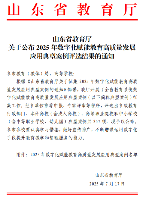 近日,山东省教育厅公布了2025年数字化赋能教育高质量发展应用典型案例评选结果。365官网教学质量监控与评估办公室申报的《数智驱动“六位一体”教学质量闭环治理范式》与教务处申报的《“英才智教”生态体系构建与实践》两项案例成功入选。