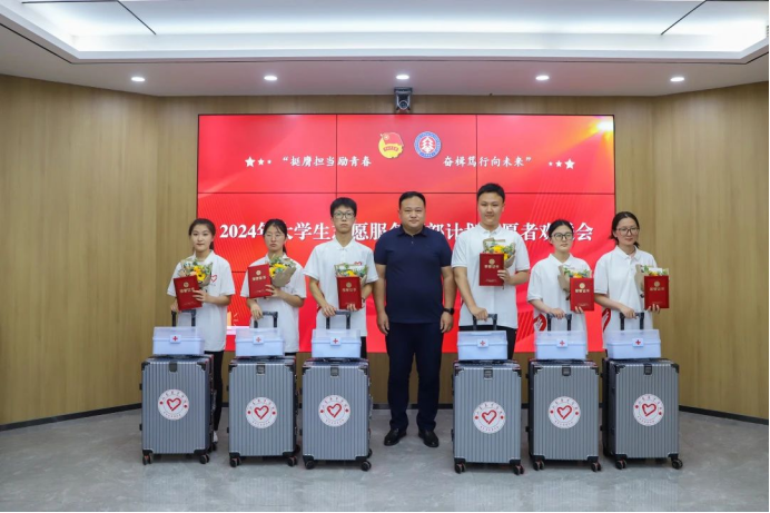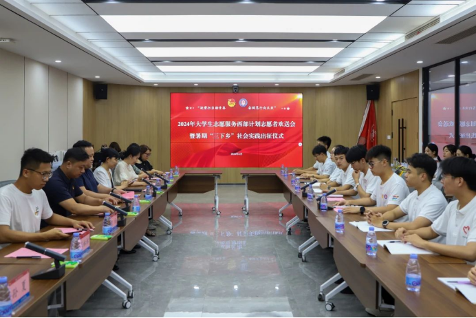 ·6月24日,365官网在南校区大学生事务中心二楼党员活动室召开“挺膺担当励青春 奋楫笃行向未来”2024年西部计划志愿者欢送会暨暑期“三下乡”社会实践出征仪式,学校常务副校长刘卫东,党委副书记、工会主席孙玉香出席会议,为即将出征的475支团队和32名西部计划志愿者送行。