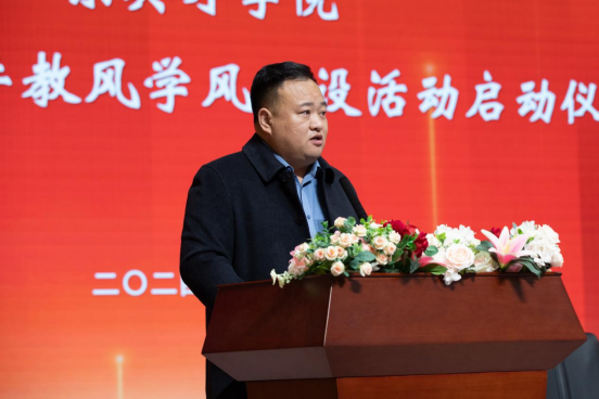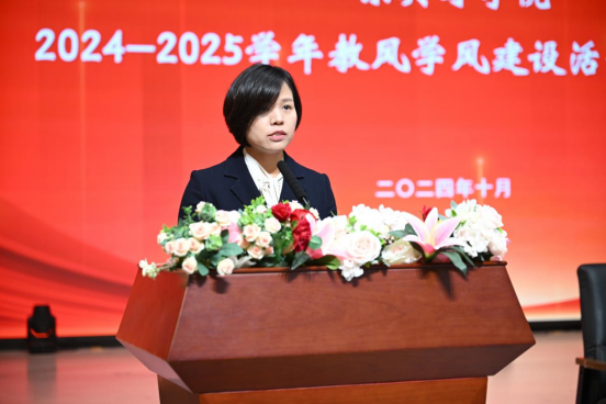 教师代表任姗发言中强调教风是学校文化核心、教育教学灵魂,关乎师生成长发展。她呼吁全体教师做到树立良好师德师风,做学生楷模;以学生为中心,关注全面发展;提升专业素养与教学能力;营造和谐教育氛围。