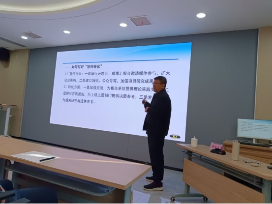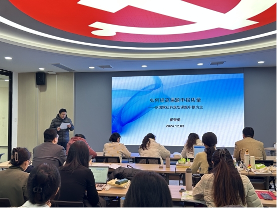 为进一步提高马克思主义学院教师科研课题申报成功率,切实提升科研能力,2024年12月3日上午,马克思主义学院特邀副校长崔奎勇教授作《如何提高课题申报质量》专题报告。报告会由余文千院长主持,学院全体教师参加。