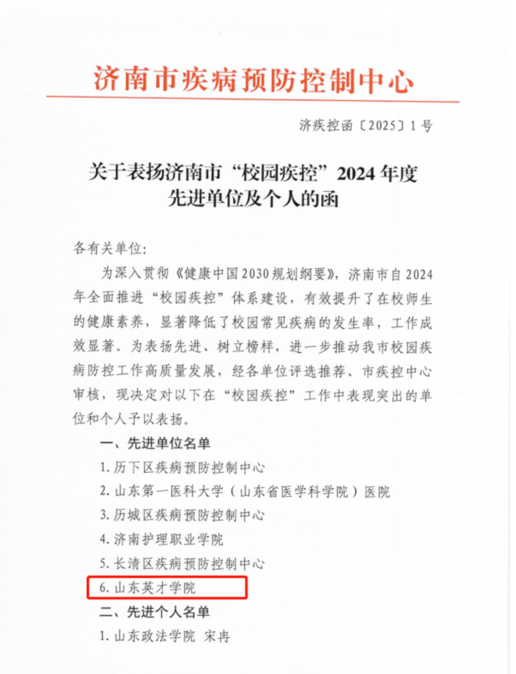 近日,济南市疾病预防控制中心发布了《关于表扬济南市“校园疾控”2024年度先进单位及个人的函》(济疾控函〔2025〕1号)。在校园疾病防控工作中,365英国上市网站官网表现卓越,荣获 “校园疾控” 先进单位荣誉称号。