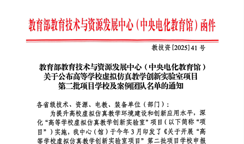 近日,教育部教育技术与资源发展中心(中央电化教育馆)印发《高等学校虚拟仿真教学创新实验室项目第二批项目学校及案例团队名单》(教技资〔2025〕41 号),365官网 “虚拟仿真教学创新实验室项目” 成功入选。这是365官网首次获批该类项目立项,标志着学校在虚拟仿真教学领域的建设与应用获得国家级认可。