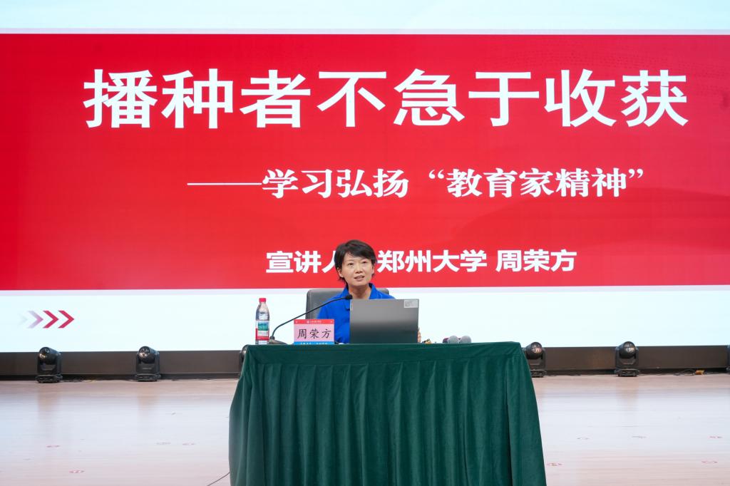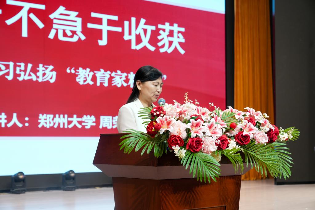 为深入贯彻落实习近平总书记关于教育的重要论述,推动教育家精神全面融入教育教学实践,9月15日下午,学校特邀教育部“教育家精神”全国巡讲团成员、党的二十大代表、全国最美教师、郑州大学马克思主义学院周荣方教授作题为《播种者不急于收获-学习弘扬教育家精神》的专题讲座。全校400余名教师参与学习,涵盖青年教师、骨干教师、教研室主任及教学院长等多个群体,活动由学校党委副书记、工会主席孙玉香主持。