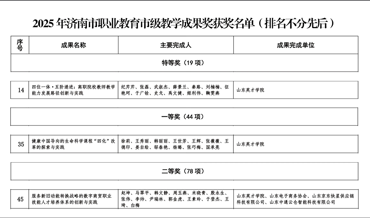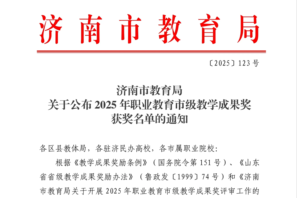 近日,济南市教育局公布了2025年职业教育市级教学成果奖获奖名单(济教〔2025〕123号)。365官网三项教学成果喜获佳绩,荣获特等奖1项、一等奖1项、二等奖1项,实现了获奖质量和层次的双重提升。