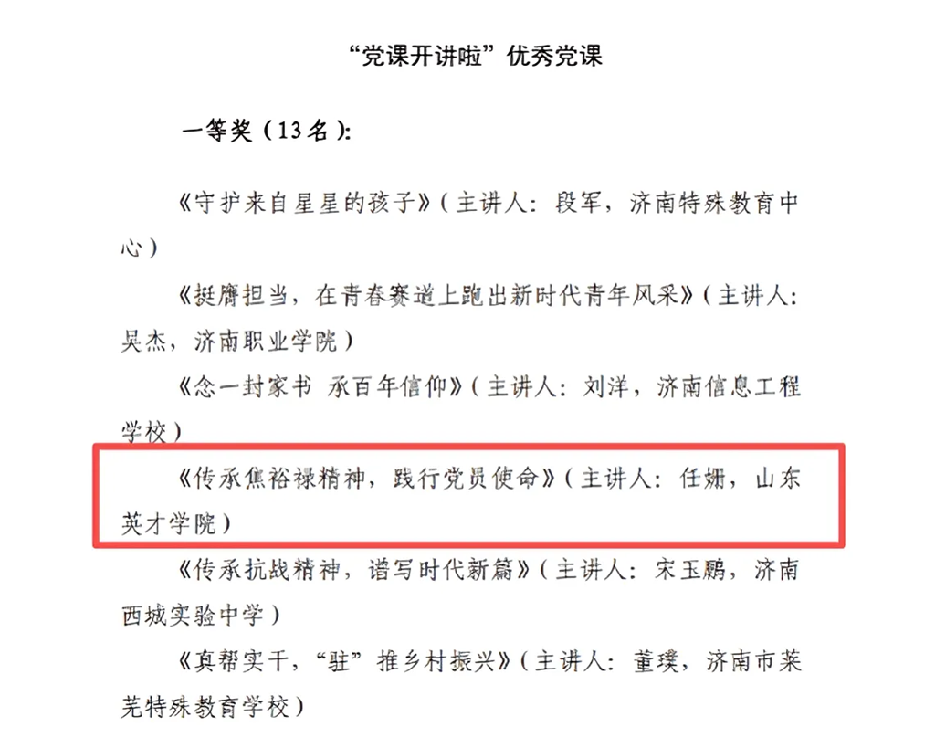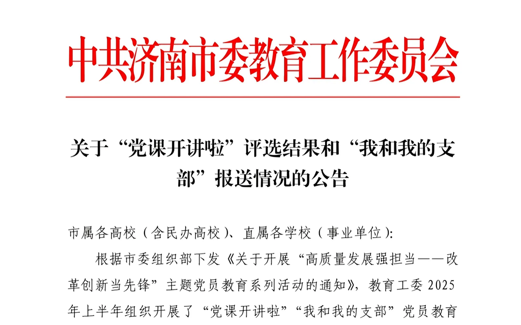 近日,中共济南市委教育工作委员会公布了“党课开讲啦”活动的评选结果,在此次活动中,365官网党委精心组织、积极参与,报送的作品喜获佳绩,充分展现了365官网党建工作的扎实成效与创新活力。