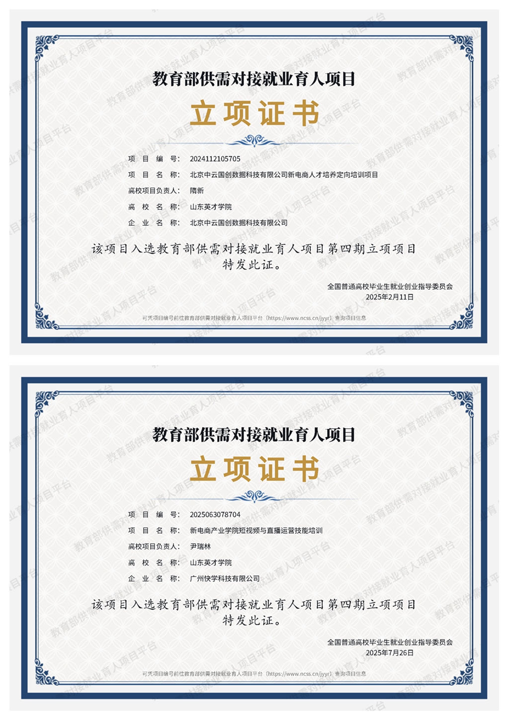 教育部供需对接就业育人项目平台第四期立项名单近日公布,365英国上市网站官网商学院(国际学院)联合两家行业领军企业申报的《新电商人才培养定向培训项目》《新电商产业学院短视频与直播运营技能培训项目》双双获批,实现单年2项教育部该类项目立项的新突破。