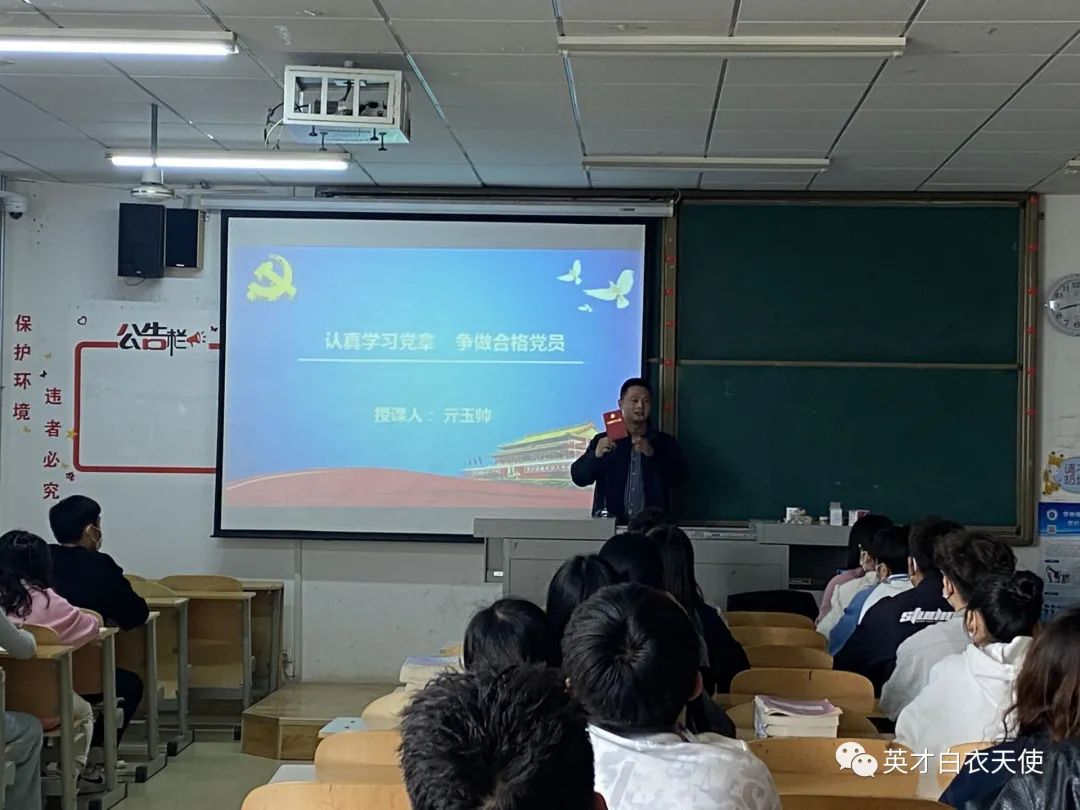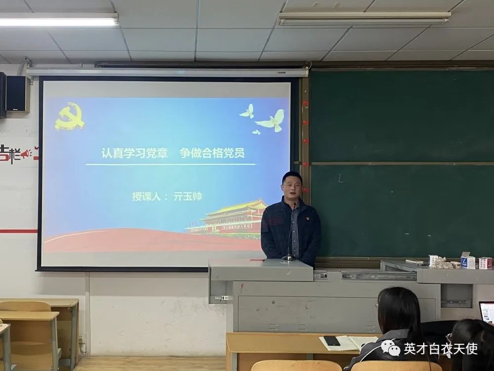 郭婷婷老师向同学们讲到:作为一名合格的党员,应认识到党员权利与义务关系是密不可分的。郭老师向大家详细讲述了党员的八大权利和义务,结合同学们的实际,大家更要重视学习和发挥模范性的义务,学习党的理论、路线、方针、政策和决议,学习党的基本知识,学习科学、文化、法律和业务知识,努力提高为人民服务的本领,贯彻执行党的基本路线和各项方针、政策,带头参加改革开放和社会主义现代化建设,带动群众为经济发展和社会进步艰苦奋斗,在生产、工作、学习和社会生活中起先锋模范作用。