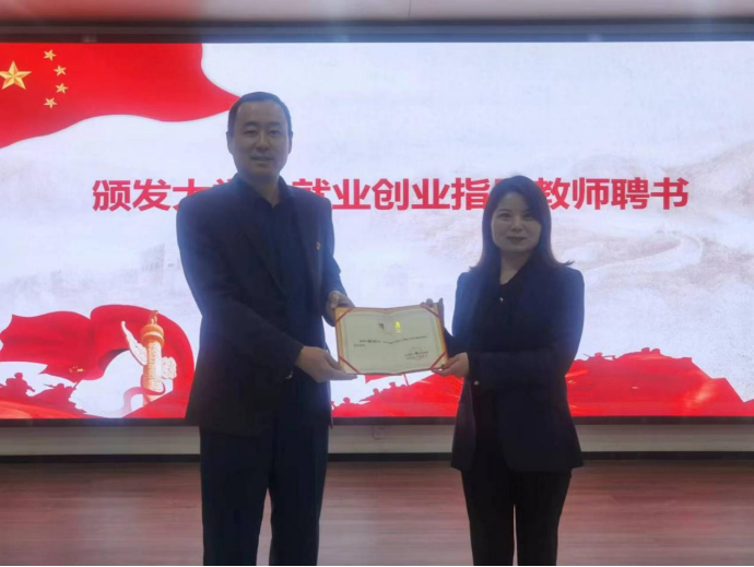我院党总支书记许鹏同志为穆引妮老师颁发大学生就业创业指导教师聘书。许书记指出,希望穆老师持续关注我院学生的成长成才,帮助更多的毕业生锚定人生方向。