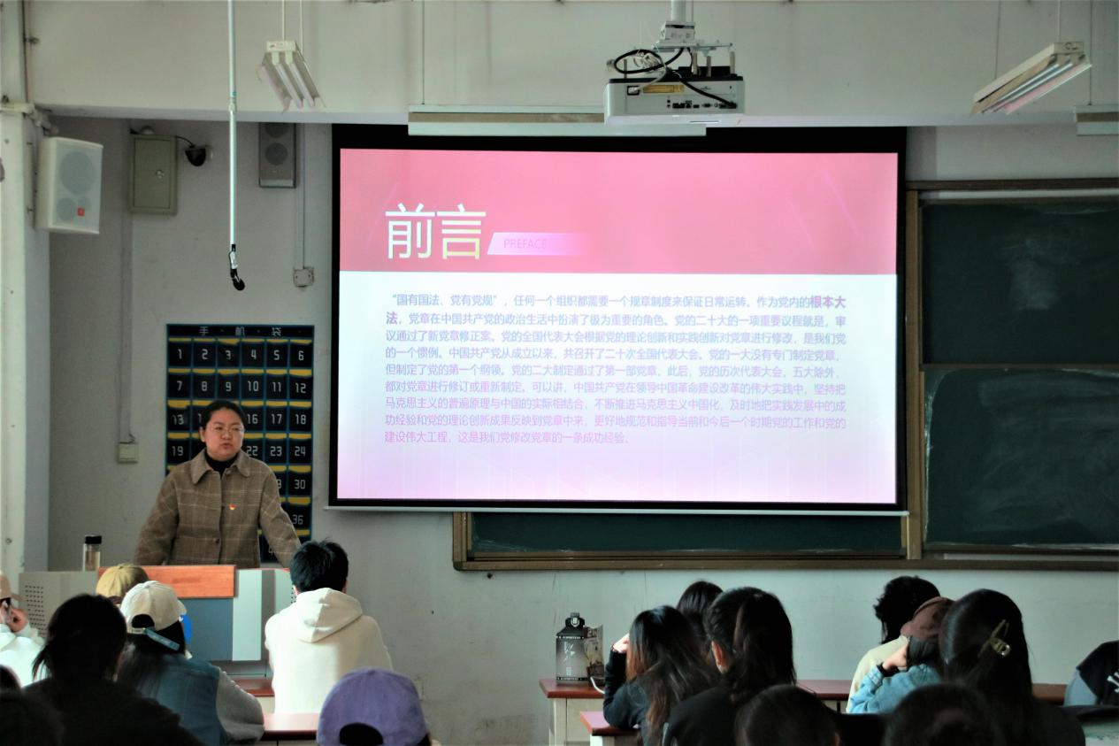 设计学院学生党支部宣传委员赵婉莉为入党积极分子讲解了《中国共产党章程》。她以党的二十大精神为思想引领,带领入党积极分子们从“党章的发展历史”、“总纲的概述”、“党的性质和奋斗精神”、“中国特色社会主义重要成就”、“党的基本路线”、“党的组织制度”等方面的知识。同时,赵婉莉老师要求全体入党积极分子认真学党章,严格遵党章,坚决严守党的纪律,努力争做一名合格的入党积极分子。