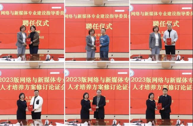王静副院长宣读《人文学院专业建设指导委员会文件》《人文学院专业建设指导委员会任职委员名单》,与会领导为各位指导委员颁发聘书。