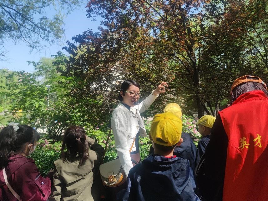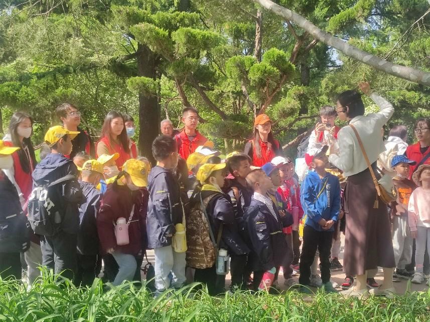 志愿者们带领小朋友开展了一系列志愿服务活动。讲解过程中,志愿团队在王辉老师与徐莉老师带领下,将公园中一路上所见到的植物,通过展示其叶片、花朵、枝干等,向小朋友们进行相关知识的讲解。